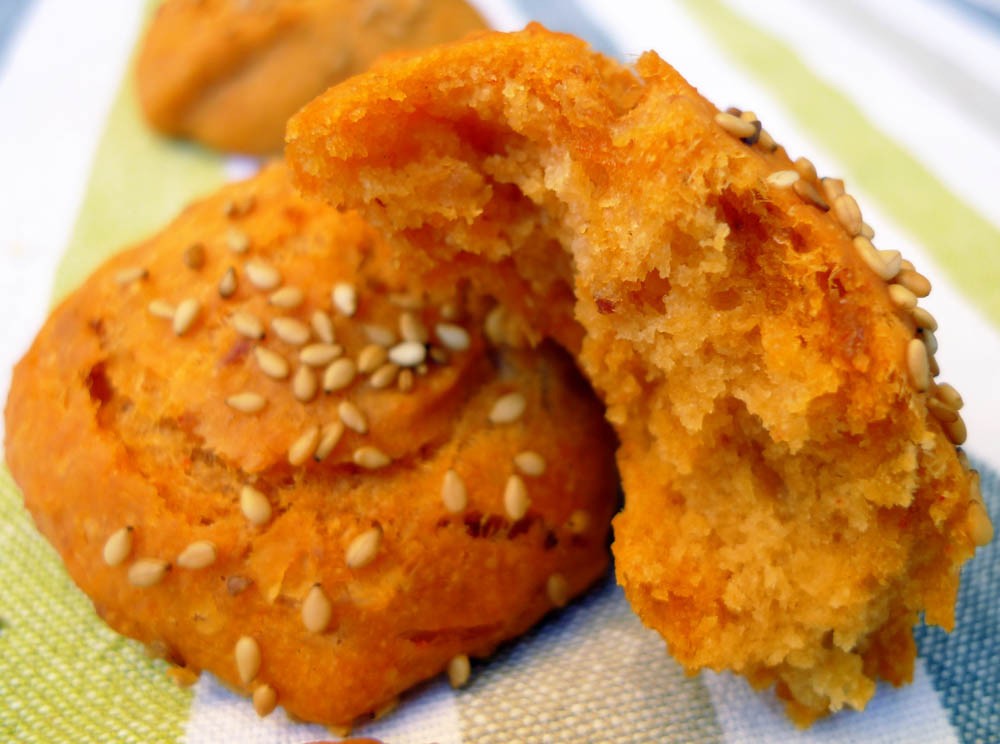 - Formamos los panecillos y colocamos en una fuente de horno enharinada o con un silpat. Esparcimos por encima semillas de sésamo y dejamos reposar en lo que se precalienta el horno a 180º.