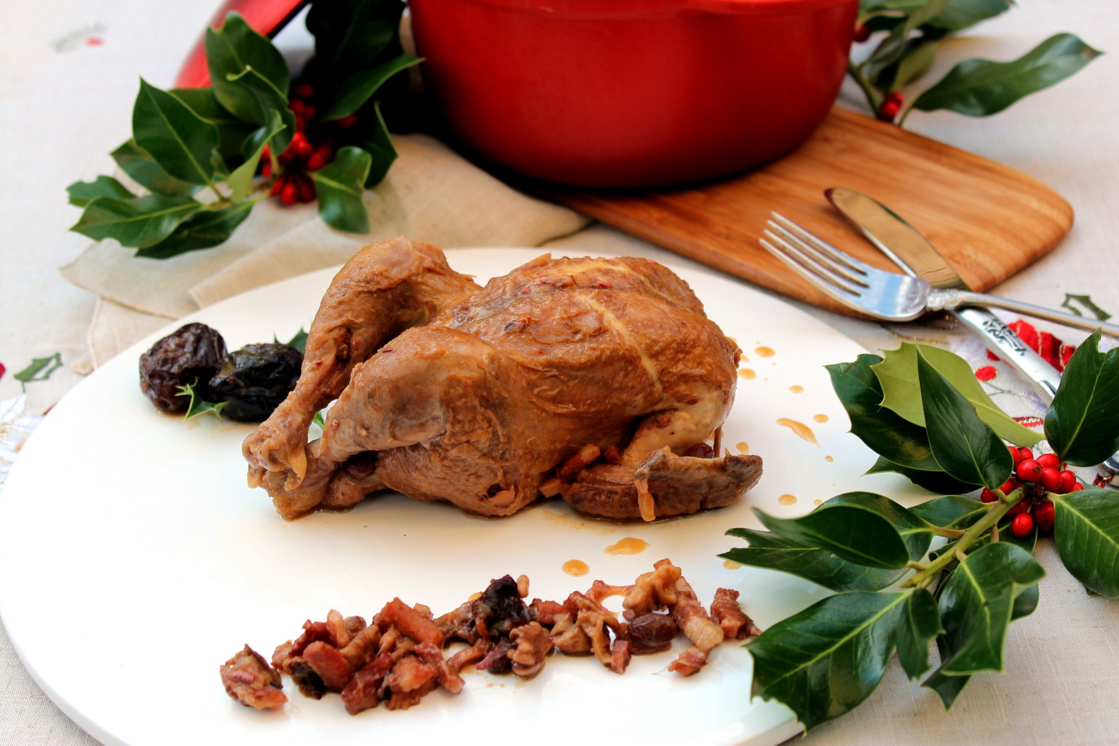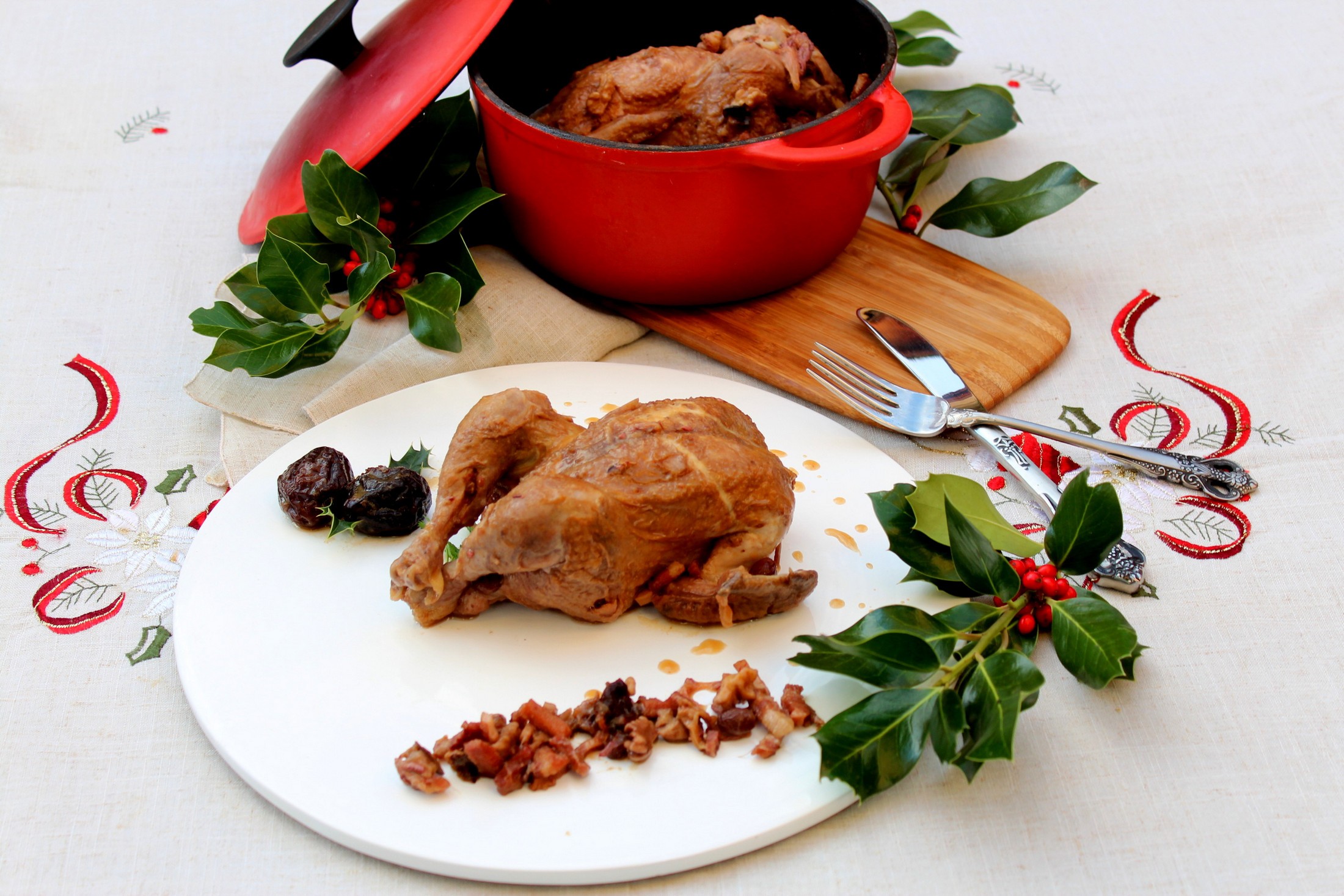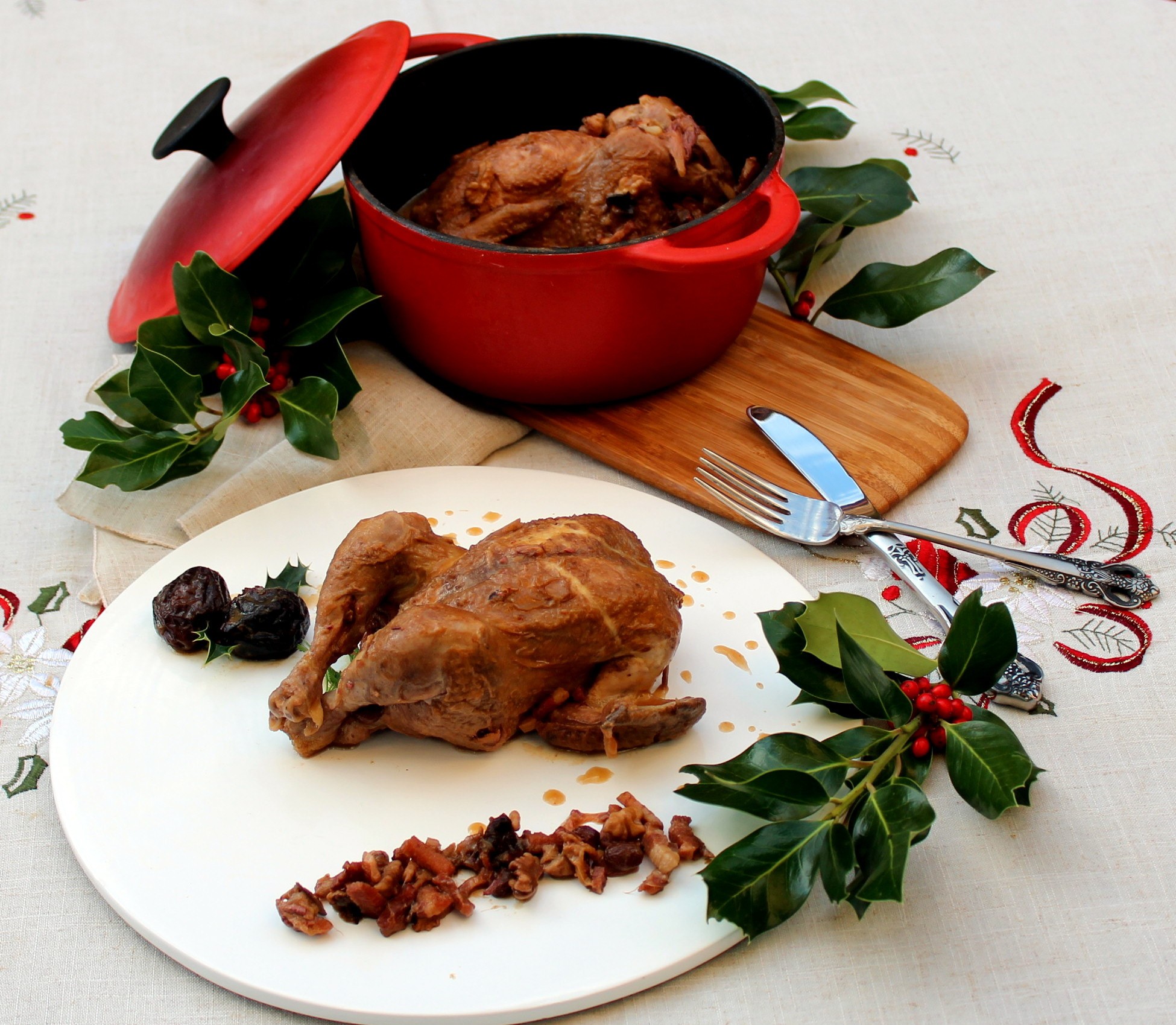 Los Picantones guisados con dátiles y ciruelas pasas son una buena opción para sustituir al clásico pavo navideño o los asados típicos de Navidad. Y lo mejor de todo es que es un plato que podemos hacerlo con varios días de antelación y calentarlo en el horno antes de su degustación.