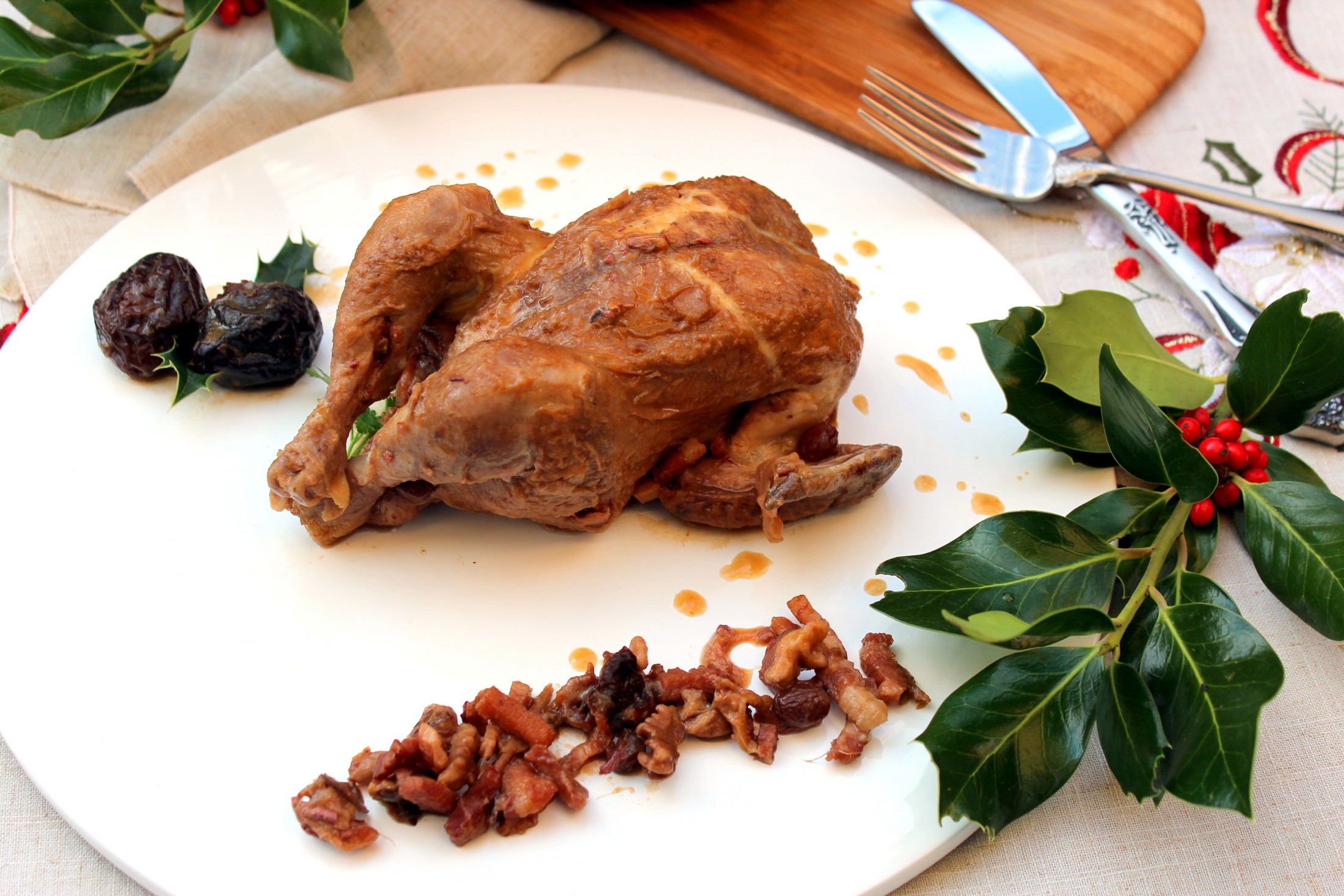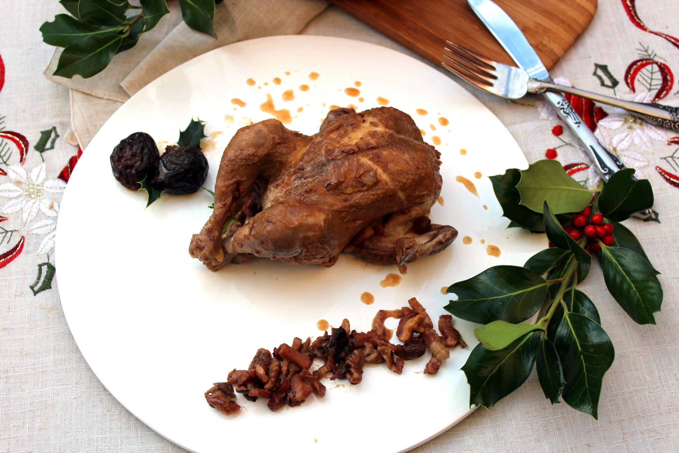Los Picantones guisados con dátiles y ciruelas pasas son una buena opción para sustituir al clásico pavo navideño o los asados típicos de Navidad.