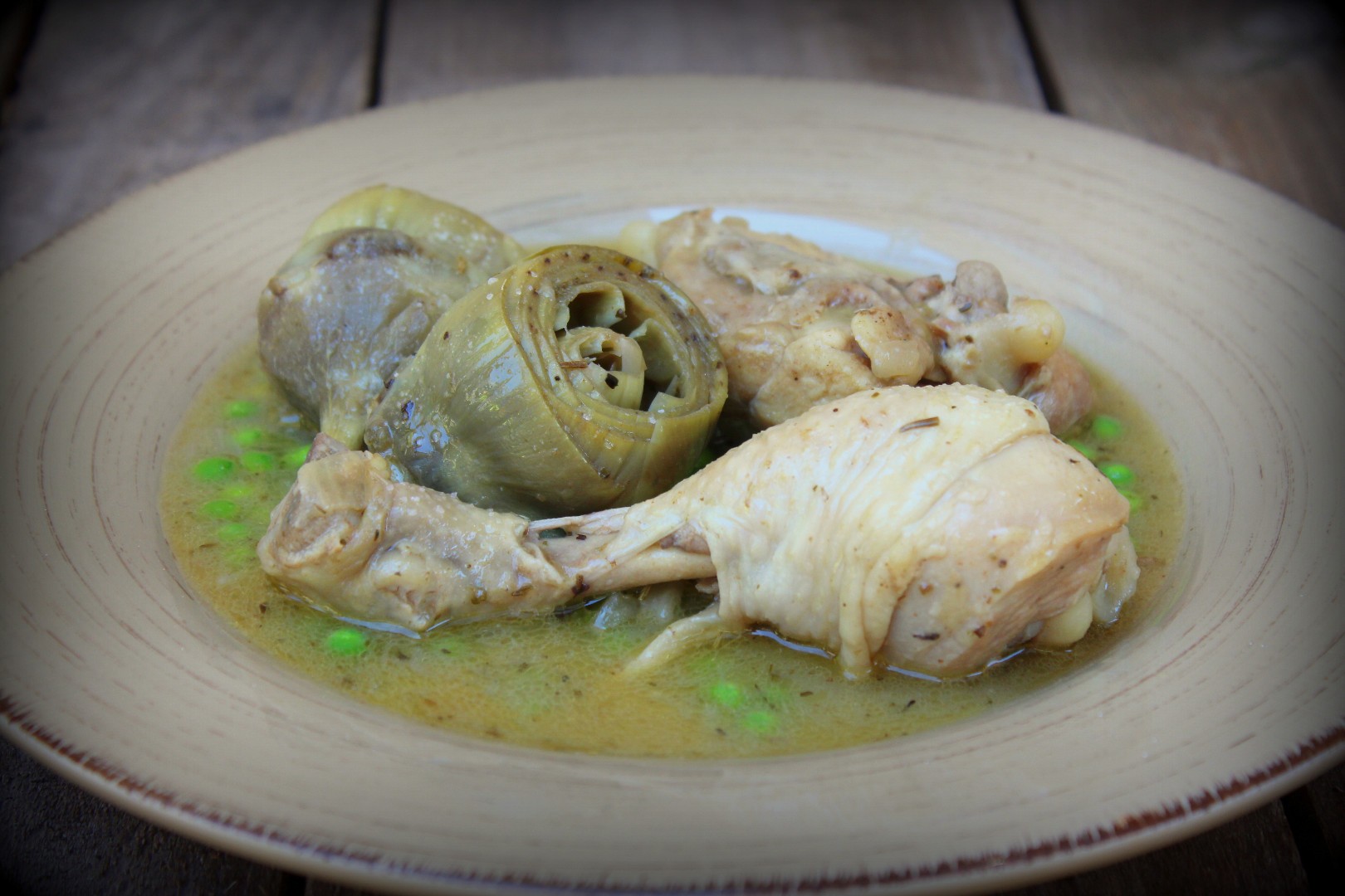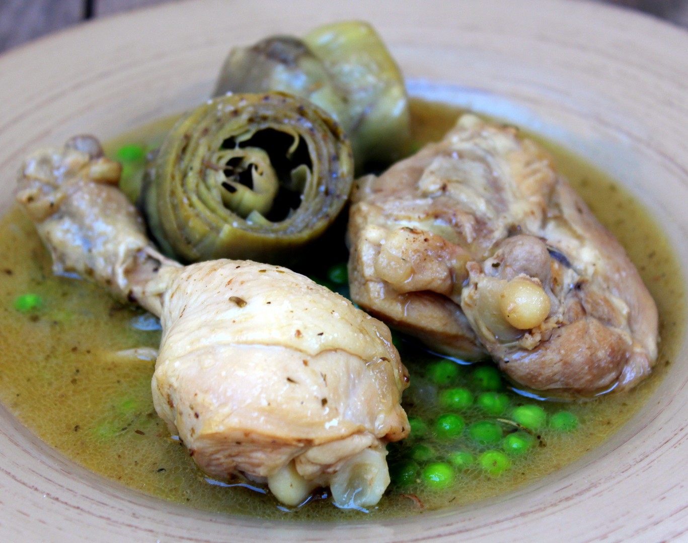 - Dejamos al fuego un par de minutos más. Retiramos y servimos el Pollo con alcachofas y guisantes.