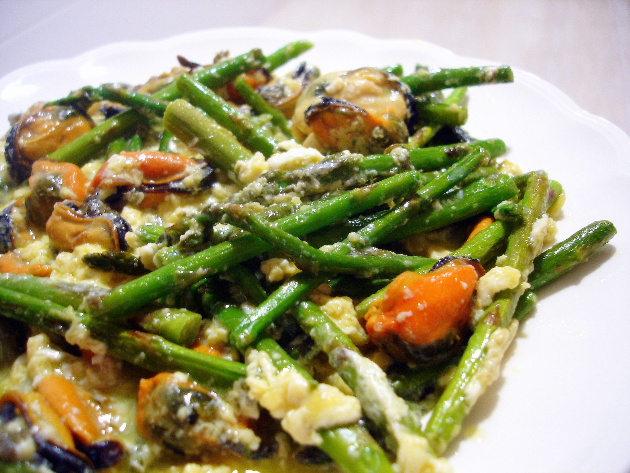 Este Revuelto de espárragos trigueros y mejillones ademas de tener muy buena pinta, es un plato original y que aportara un toque distinto en vuestra mesa. Animaos a cocinarlo, seguro que gusta a toda la familia.