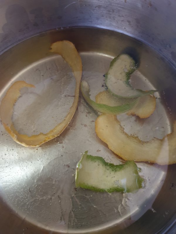 2. Llenamos hasta un tercio de capacidad un cazo o cazuela (donde entren bien los cuatro lomos de salmón) con aceite de girasol. Incorporamos la piel de la naranja y la lima junto con la nuez moscada.