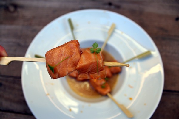 - Sacamos, insertamos dos o tres trozos de salmón en brochetas y colocamos en un plato de presentación.