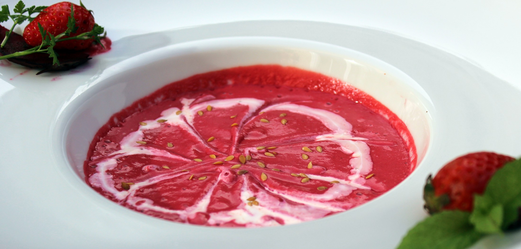 - A la hora de servir el salmorejo de remolacha y fresas podemos hacerlo en cuencos, platos soperos, copas de cristal, vasos, etc., lo que prefieras para la ocasión. Acompañamos con un hilo de la crema de queso Cabrales y unas láminas de fresa y remolacha fresca.