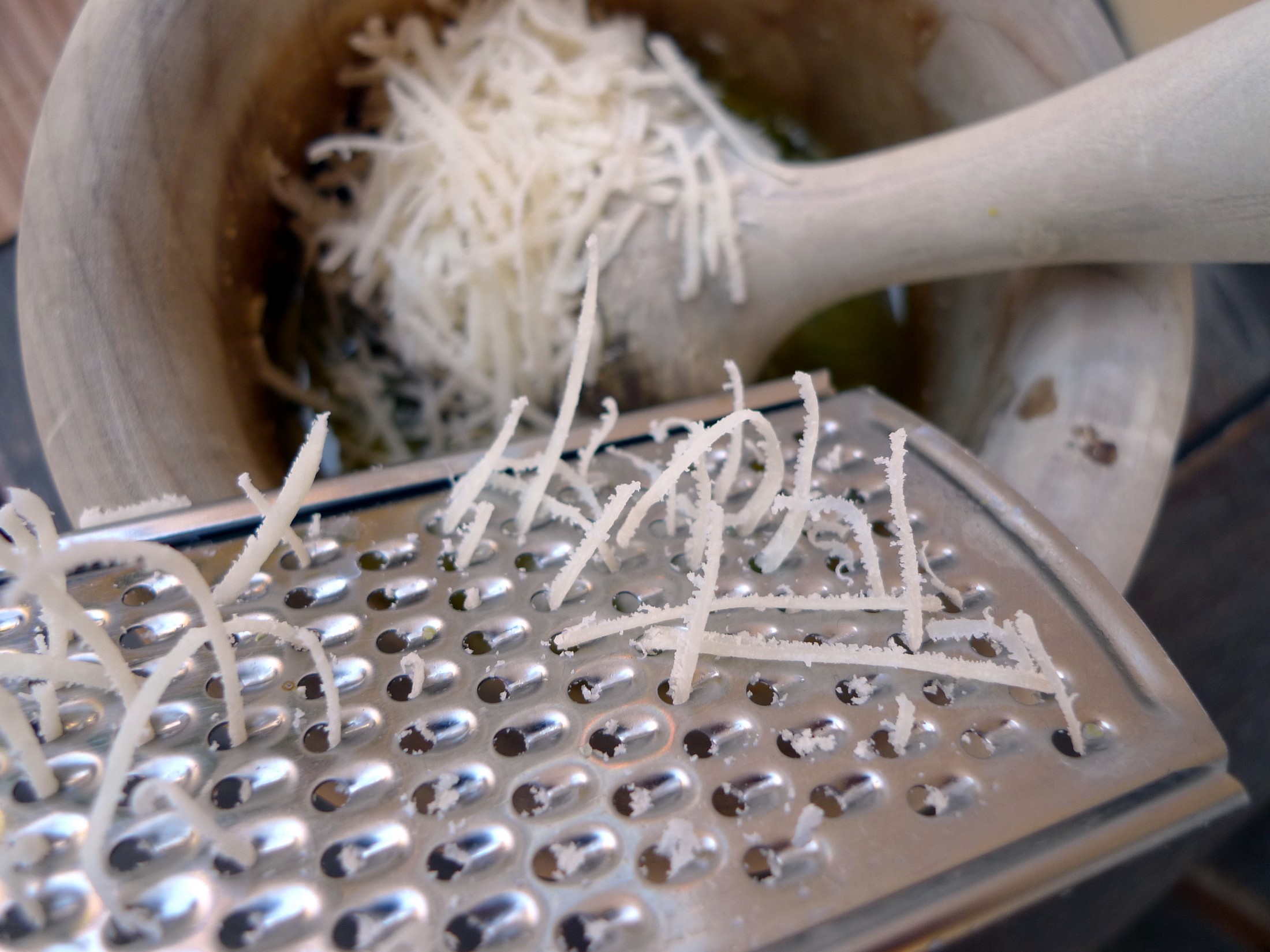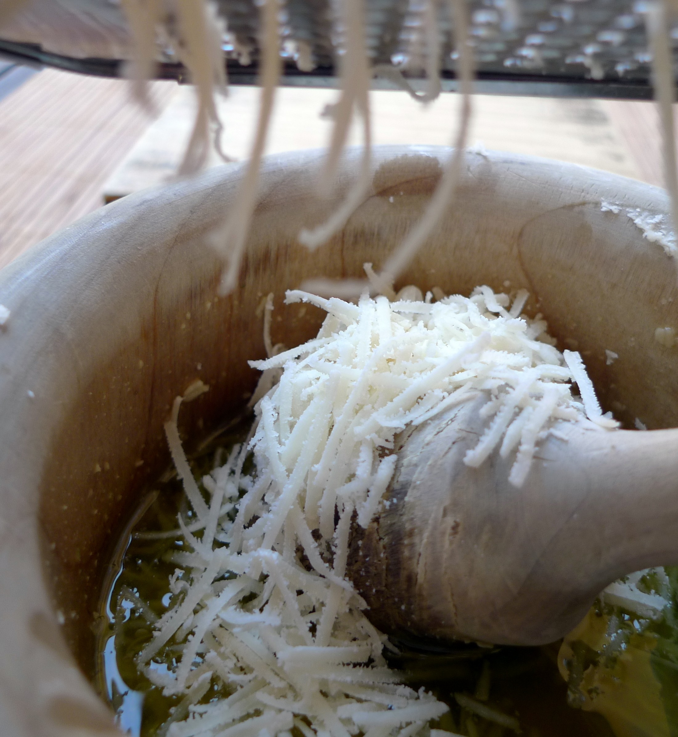 - Incorporamos el queso rallado, en nuestro caso Grana Padano, y volvemos a machacar todo el conjunto.