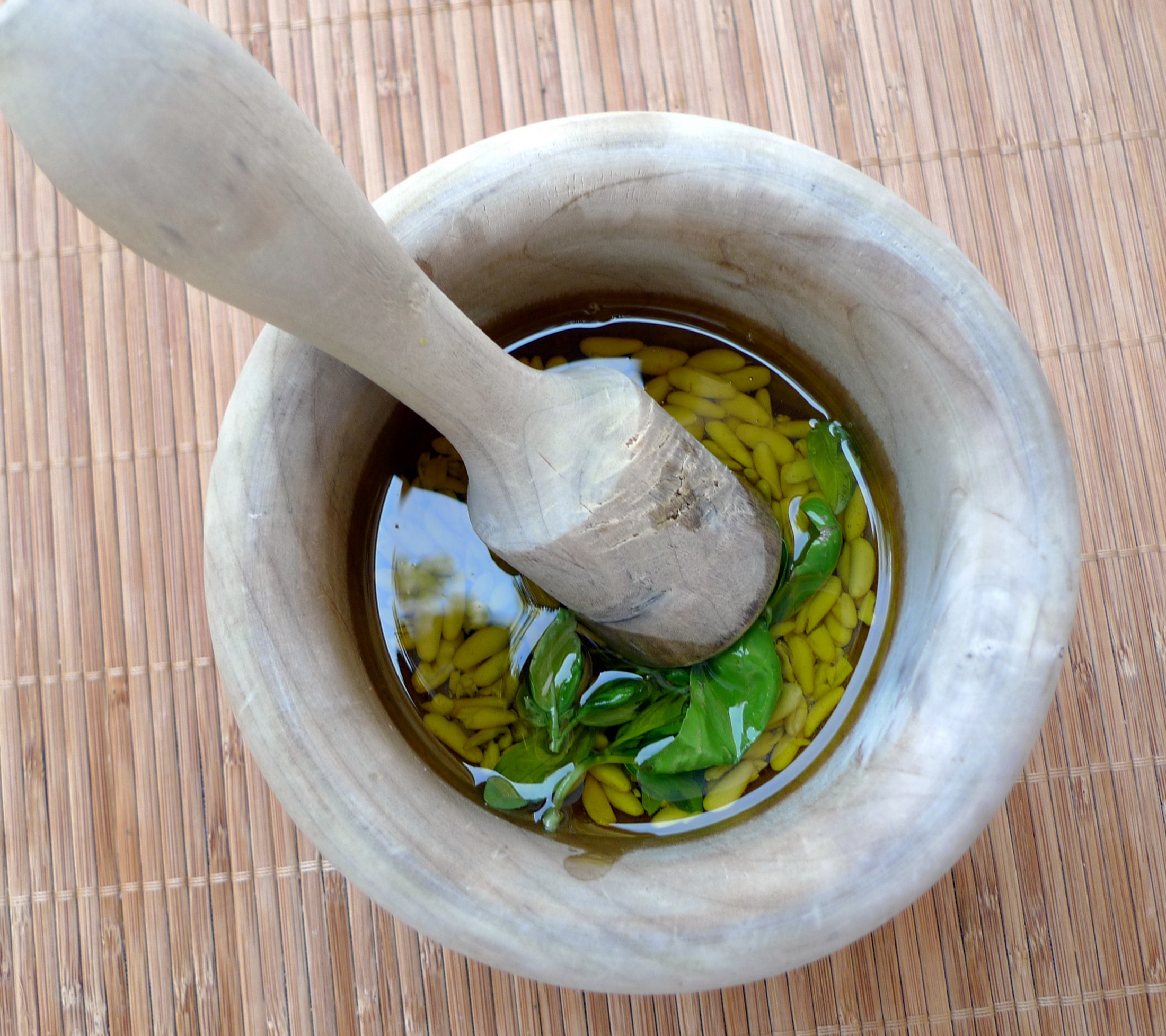 - Echamos en un mortero los piñones (pueden estar previamente dorados en una sartén), con unos granos de sal gruesa marina, las hojas de albahaca y el ajo.