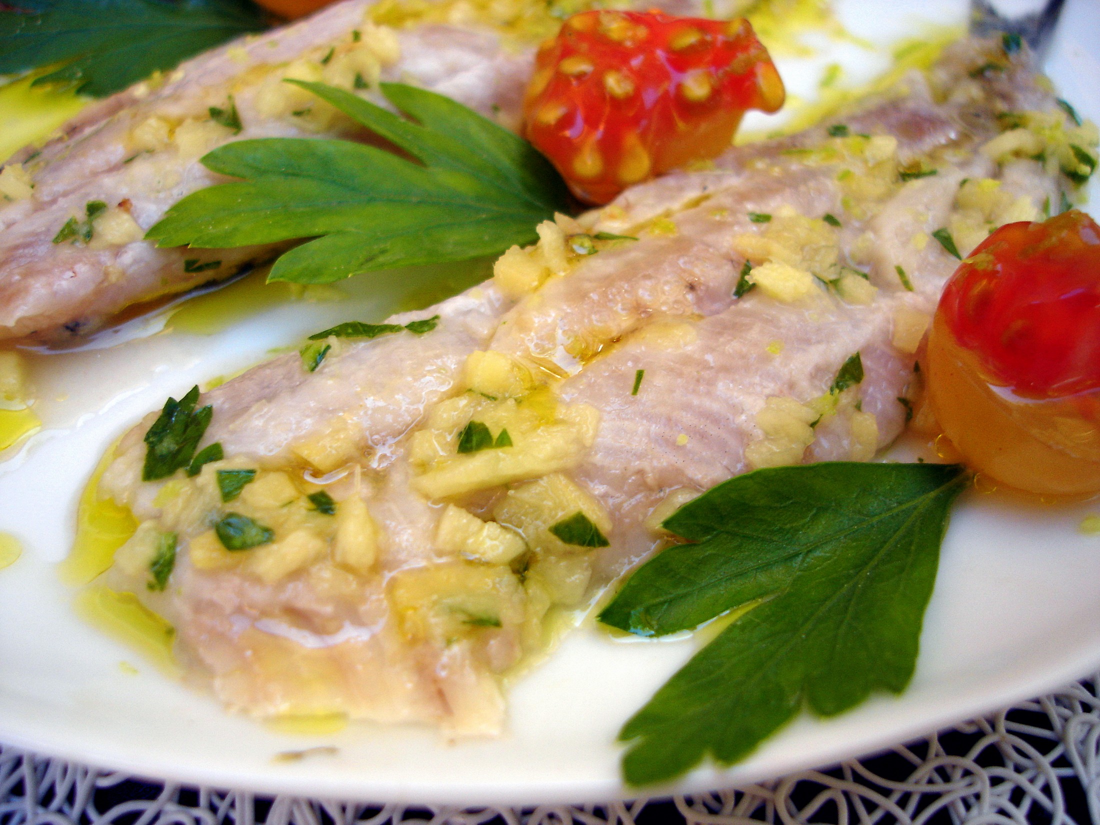 - Colocamos en un plato limpio sardinas marinadas con la carne hacia arriba, y rociamos con un hilo de aceite de oliva virgen extra.