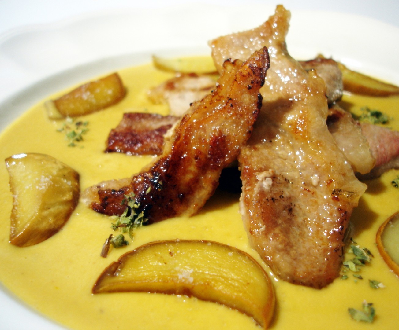 Cuando tengas invitados a cenar y quieras sorprenderles, sin gastarte mucho dinero en el intento, nada mejor que esta receta: «secreto ibérico con crema de batatas y castañas con boletus«.