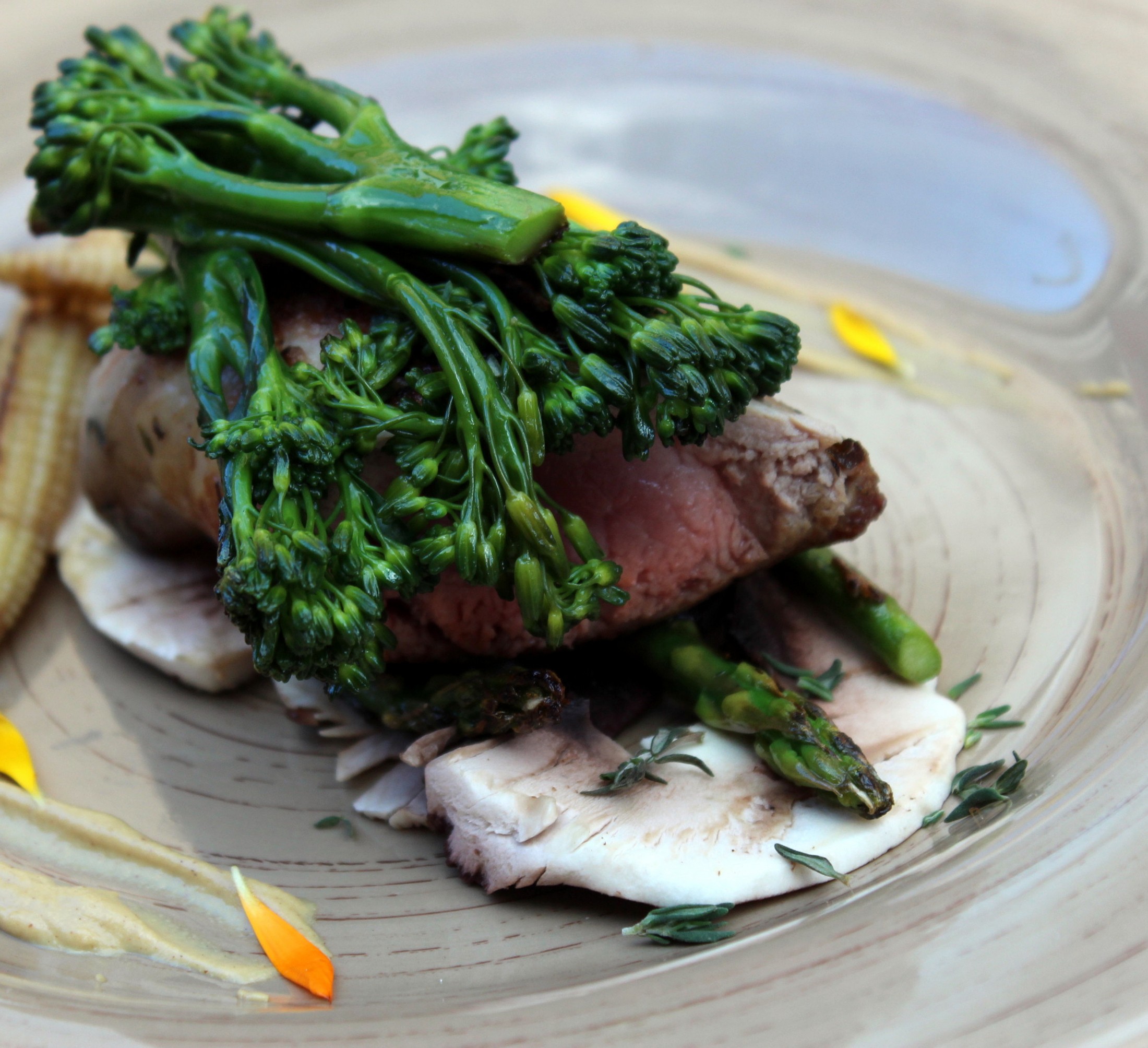 - Colocamos encima de los espárragos trigueros un trozo de solomillo de cerdo ibérico y encima de estos el bimi.