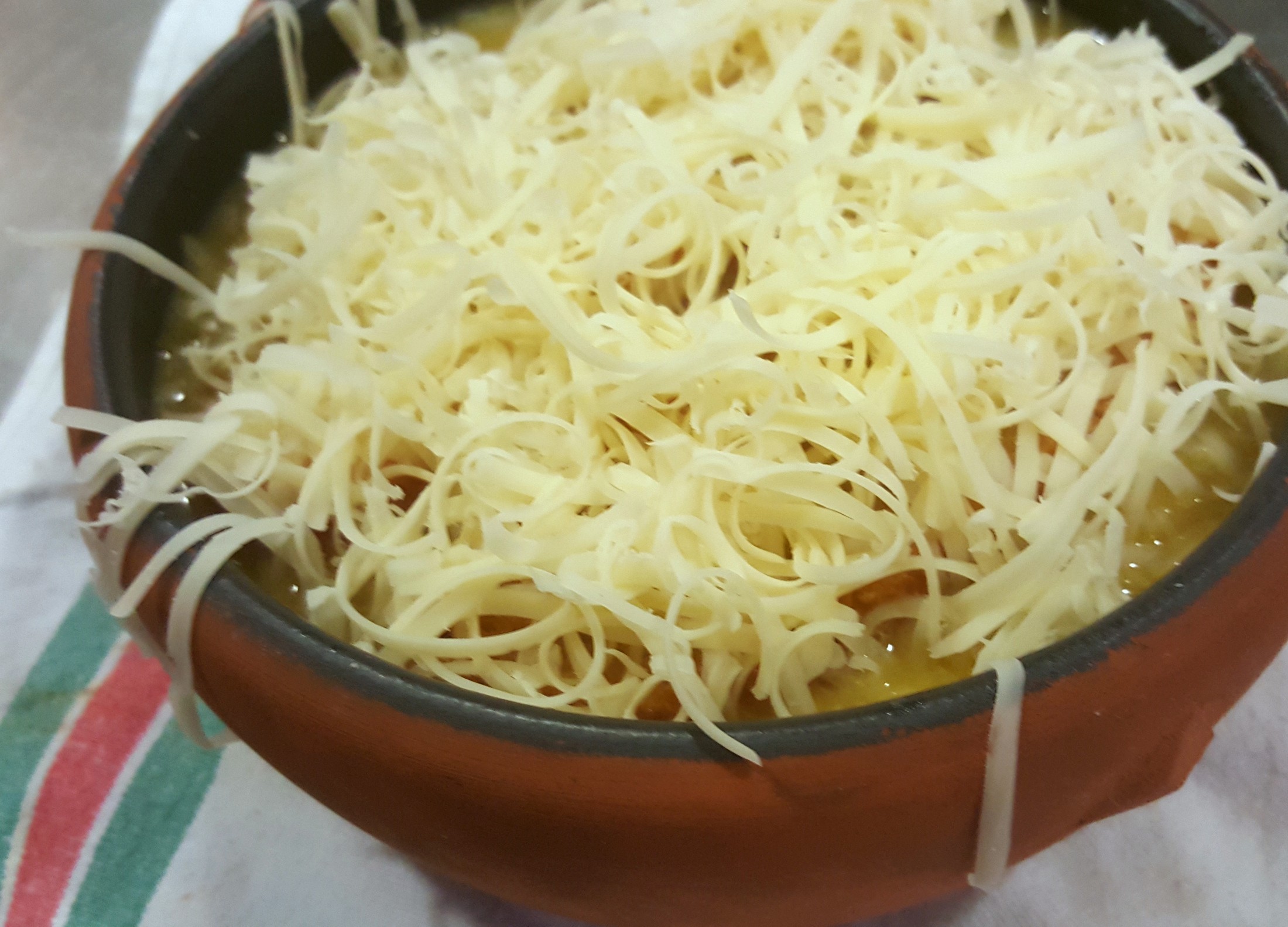 Rectificamos el punto de sal de la sopa de cebolla, si hiciera falta, y repartimos en cuatro cuencos aptos para el horno.