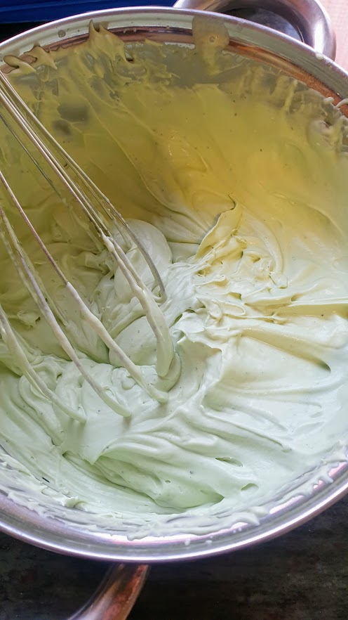 9. Echamos la nata -que habremos tenido en el frigorífico- en un cuenco junto con el té matcha. Batimos con la ayuda de unas varillas y agregamos el azúcar glas, de poco en poco, hasta que la nata esté montada.