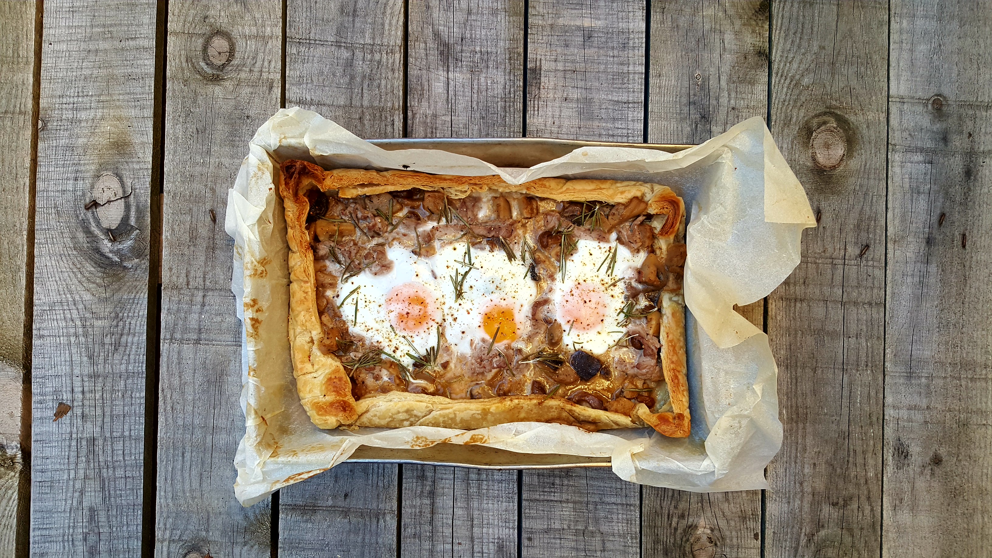 - Una vez hecha la masa de hojaldre, sacamos del horno, repartimos el salteado anterior y vertemos la nata por encima.