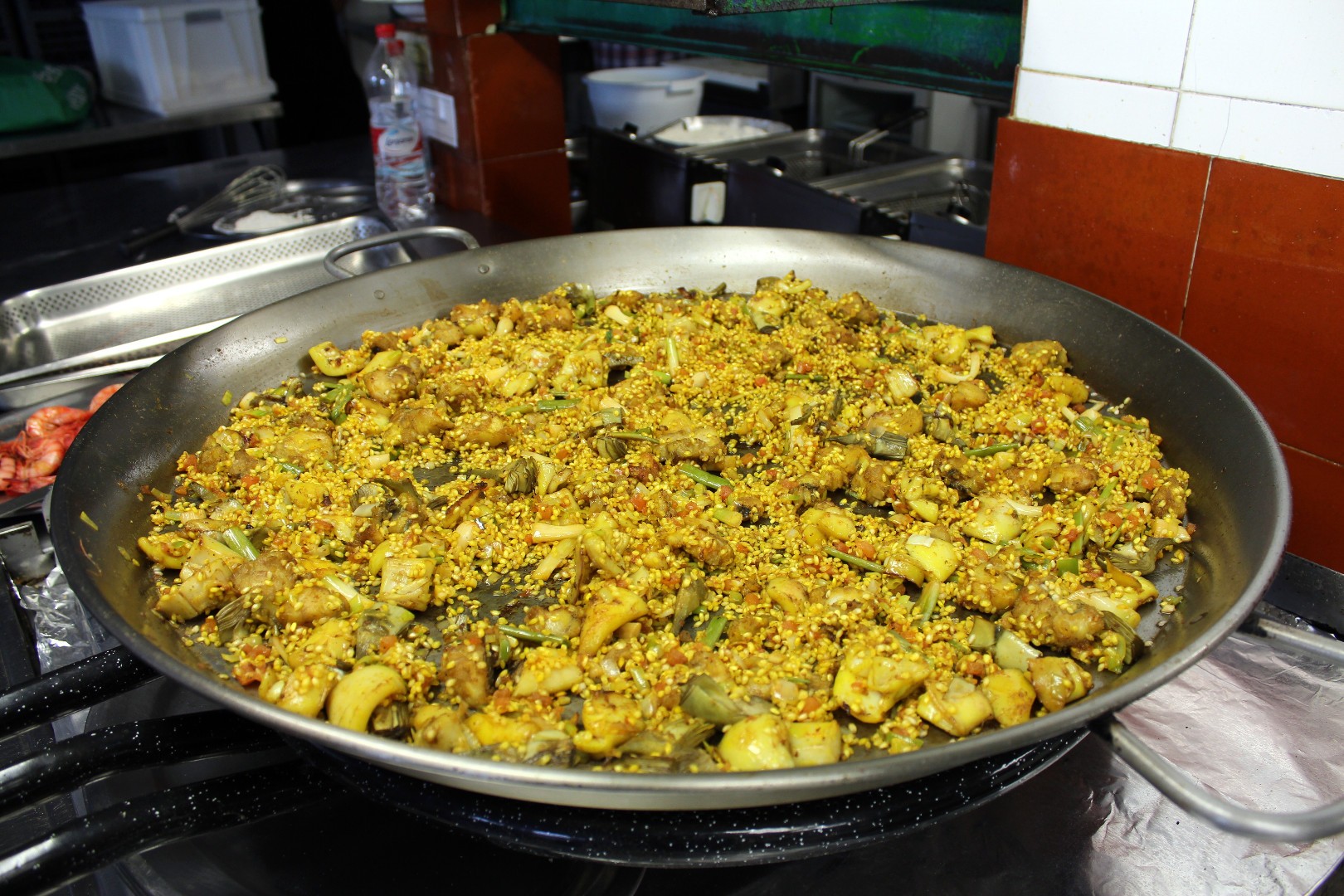 Primero, en una paella con aceite de oliva, se saltea el marisco, en esta ocasión unas gambas rojas que más bien parecían por su tamaño carabineros, se sacan a una bandeja. En ese mismo aceite de oliva se sofríe sepia y rape, limpio y cortado en trozos, hasta que se dore. Se añade ajetes limpios y cortados en trozos, además de puerro y tomate natural picado, mezclamos, añadimos corazones de alcachofa limpios y cortados en trozos, dejamos hacer, removiendo de vez en cuando, hasta que esté la verdura pochada.
