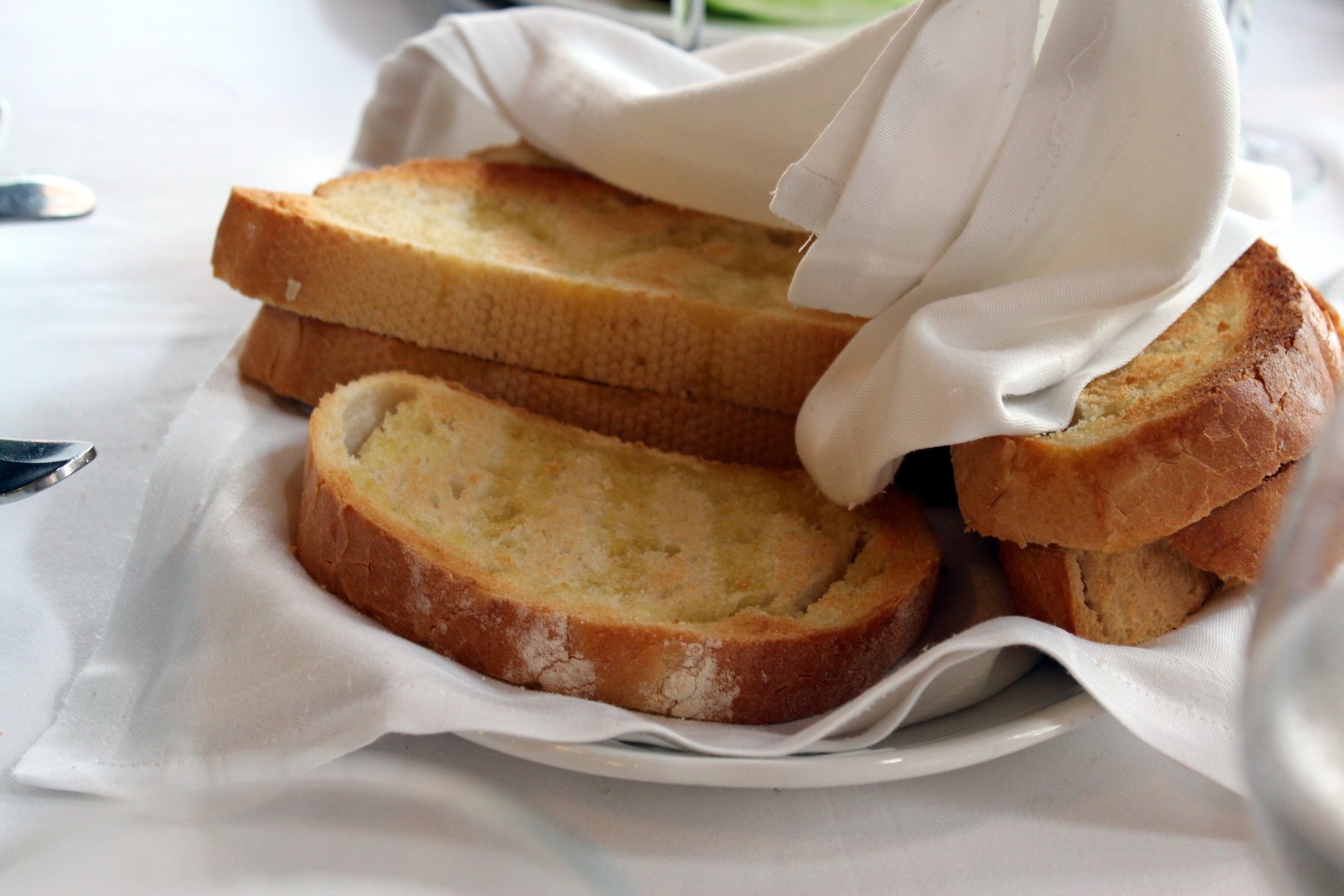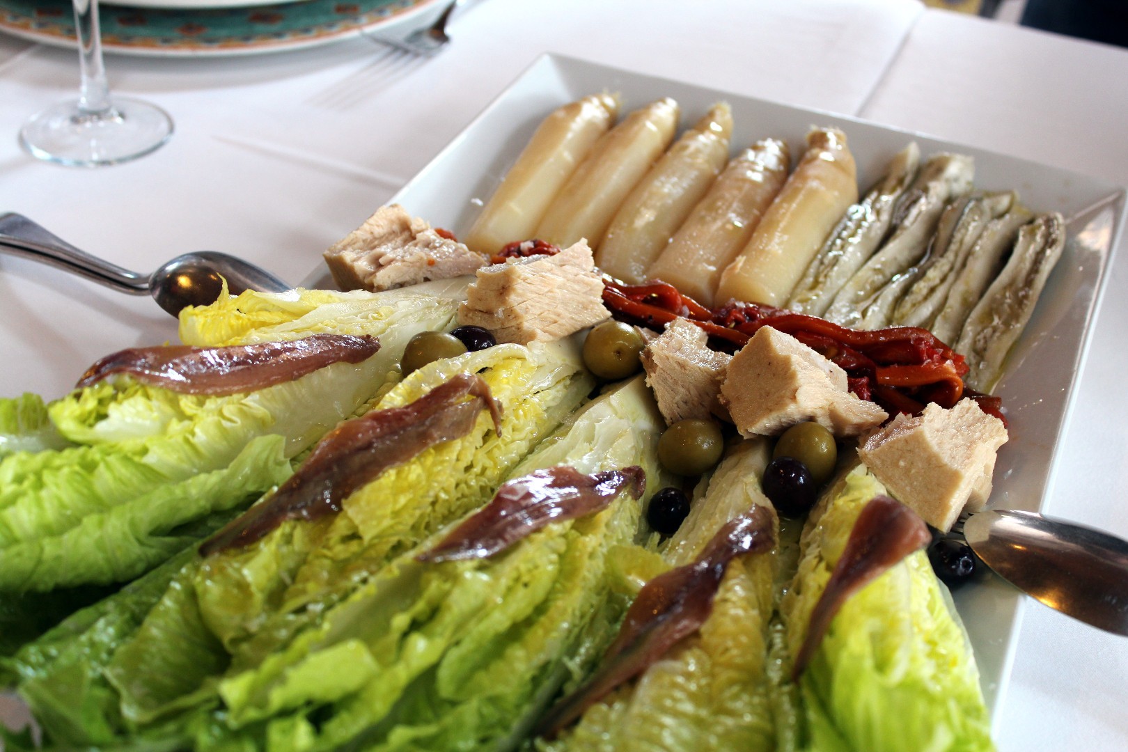 De primero una bandeja compuesta por espárragos, pimientos y berengenas asadas y aliñadas, atún en conserva, cogollos de lechuga con anchoa, acompañado todo ello por unas rebanadas de pan tostadas. Buenísimo!