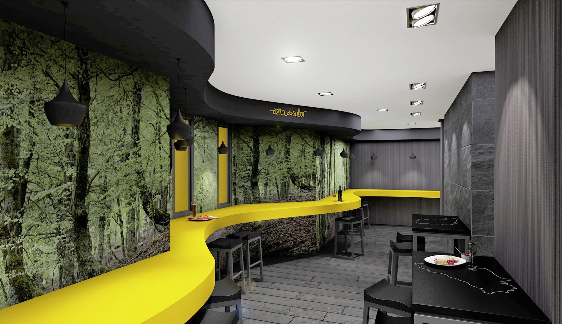 Partiendo de esto, se deberá solicitar a la Consejería (a modo de franquicia), una «licencia» para abrir un espacio Tierra de Sabor Club Selección. Un espacio igual para todos los que se creasen en un futuro, en tonos negros y amarillos, adaptable a cada local de los solicitantes.