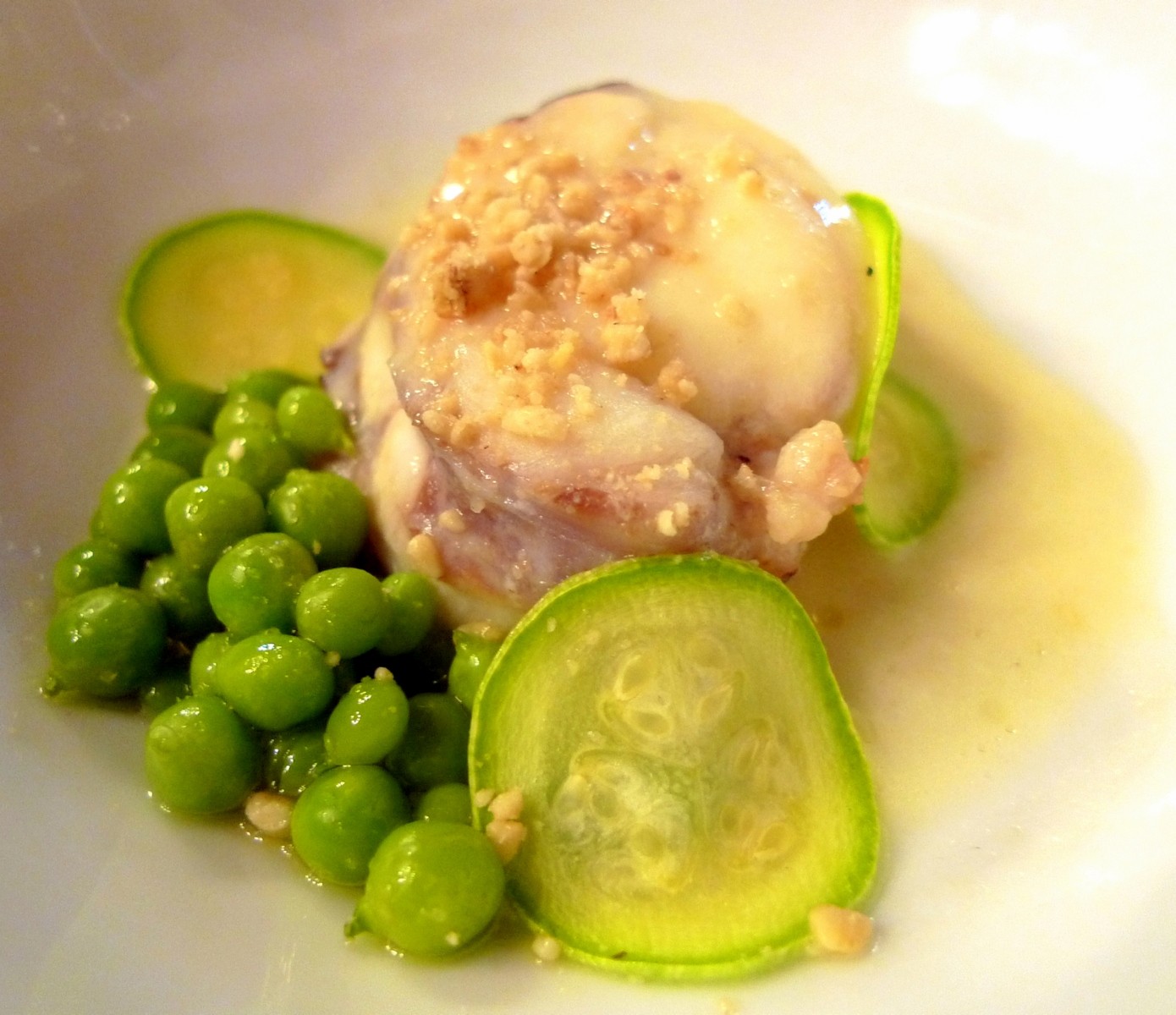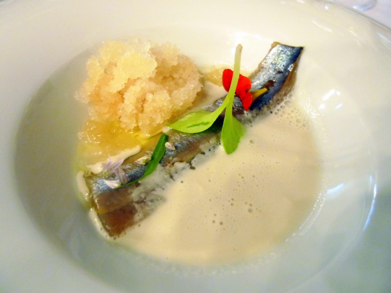 Le sigue muy de cerca, en calidad y sabor, un “Ajo blanco de piñón de Pedrajas, sardina marinada con hojas anisadas y granizado de uva”. Un plato lleno de matices y diferentes sabores que, si bien la sardina marinada no gustaba a la mitad de la mesa (éramos cuatro), resultó ser una gran sorpresa.