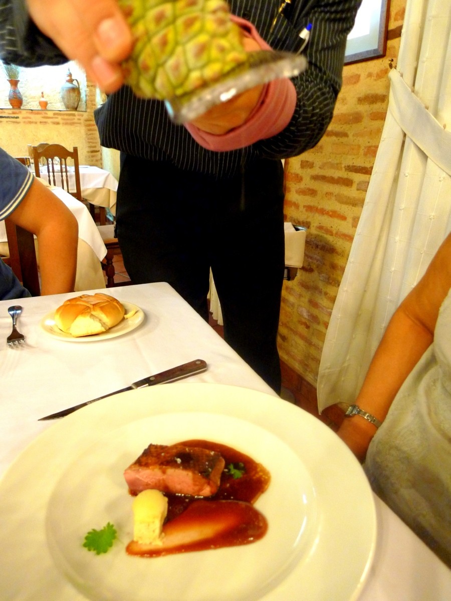 Continuamos este viaje de sabores del pinar con una “Pechuga de pato soasada, con un jugo acidulado, pan de piñones y aire de Perpetua, hojas tiernas de pimpinela menor”. Un plato de sabores enfrentados (el aire de perpetua es único), que armonizan entre ellos a la perfección. Como dato curioso el camarero adereza este plato, in situ ante la atenta mirada del comensal, con piña verde recién rallada.