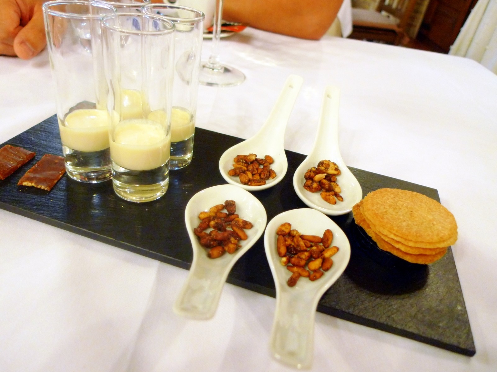 Para comenzar tres aperitivos en uno: “Vermú elaborado con vino de nuestra cosecha y diferentes plantas del bosque”, “Mousse de pichón con una cobertura de piña verde y mil en rama silvestre” y “Minimagdalenas de pino piñonero y raíz tostada de achicoria”. Tres propuestas que se complementan a la perfección. Destacar la esponjosidad del mousse de pichón y el refrescante y peculiar sabor del vermú.