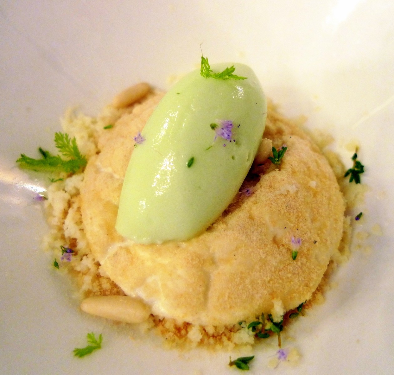 Otro de los “buques insignias” de La Botica es “Piñones y Pinares, Homenaje al Bosque de Pinos 2007”. Una espuma de piñón, arenas de diversos bizcochos (piñones, corteza de pino, romero, etc), helado de piña verde y variadas hierbas. Inolvidable.