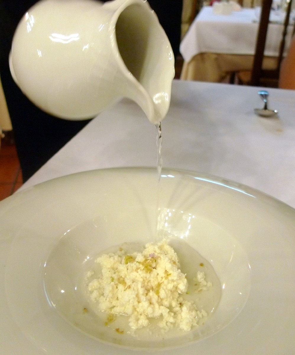 El famoso “Capuchino de morcilla de piñón artesana y espuma de pan de pueblo” fue el plato que seguía en el menú degustación. Como siempre, sabor y textura para una propuesta de la que De la Cruz ha sacado muchas satisfacciones.