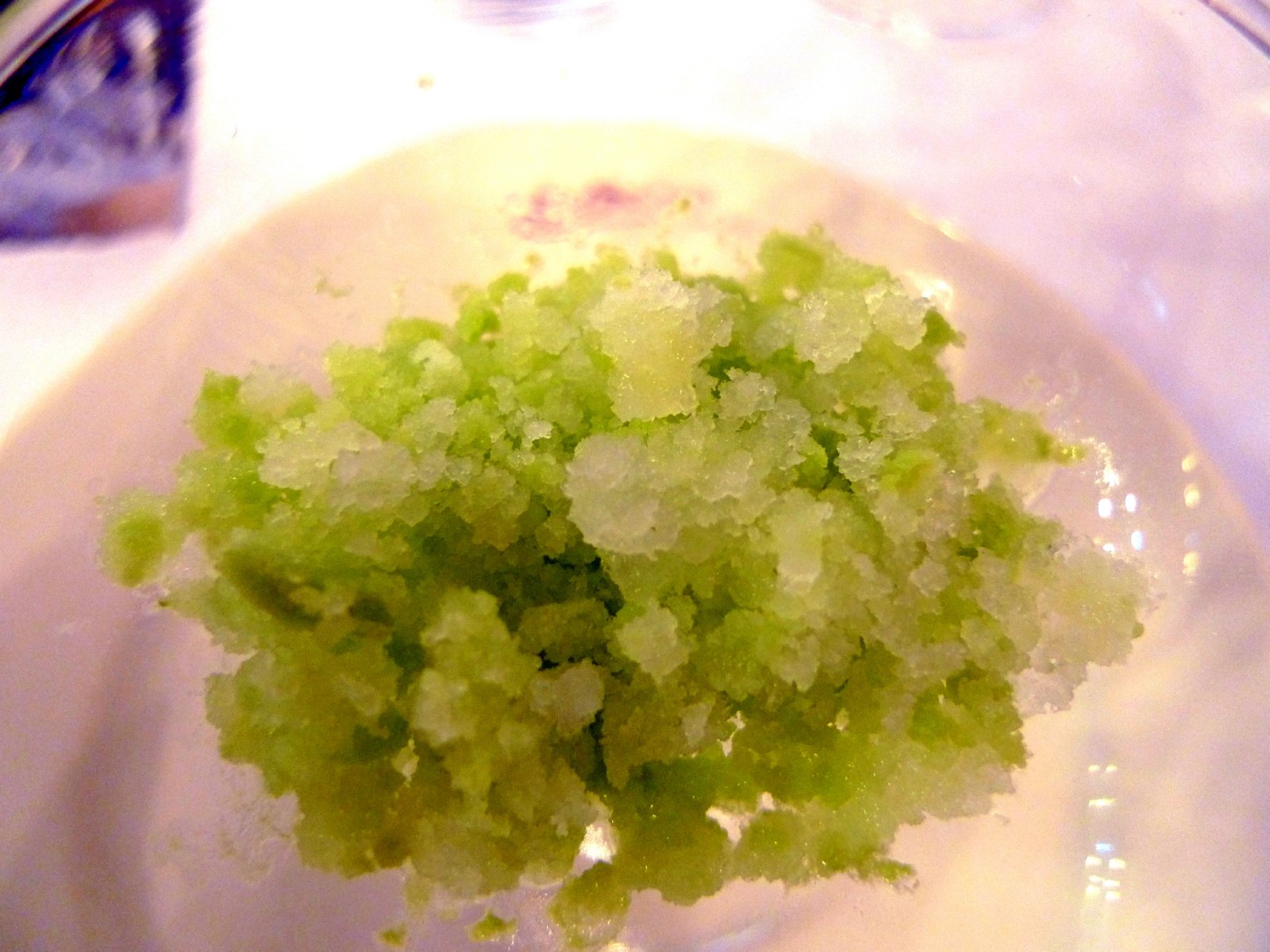 Para cambiar de pescado a carne un sorbete de nombre peculiar: «Sobre la piña verde, su zumo Granizado”. Astringencia, muecas raras en la cara, astringencia, sabor, más astringencia, satisfacción… Es lo que se siente cuando tomas, cucharada a cucharada, el sabor de la piña verde.