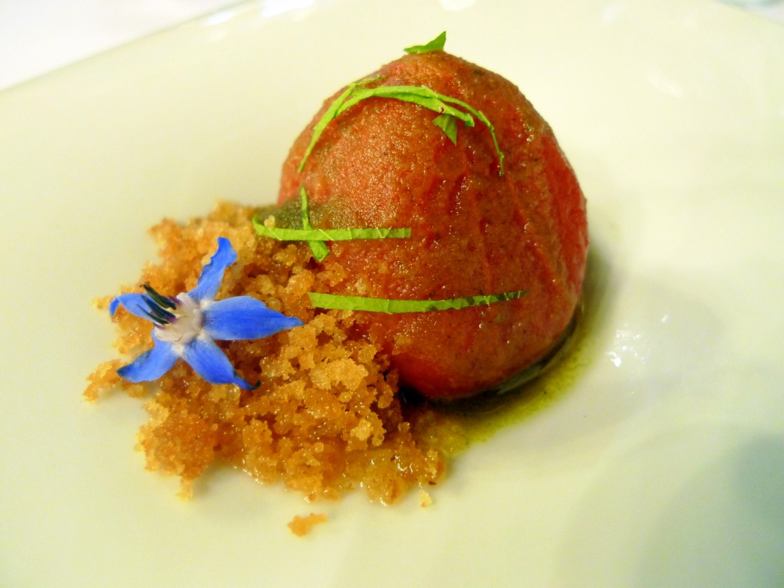 A continuación, sin duda, el mejor plato del menú: “Tomate escarchado con tierra caliza, pesto, migas fritas y hojas tiernas de Alliaria de rio”. Sabor, textura, técnica y paciencia, mucha paciencia, es lo que Miguel Ángel presenta en esta propuesta. Impecable.