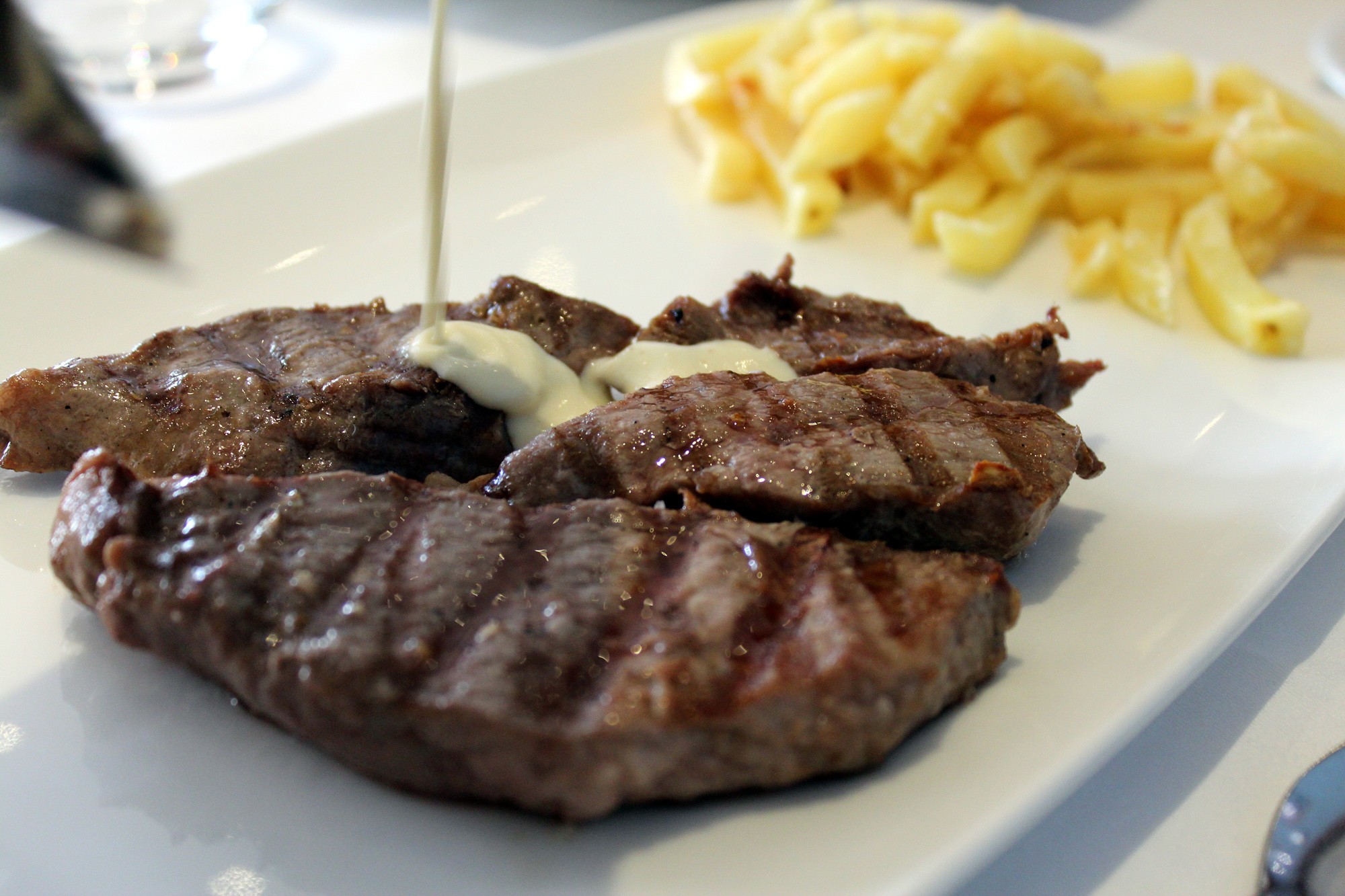 Para los niños, que venían con nosotros, una «Lasaña de Atún» (dos unidades 9€), muy ligera y con una textura muy esponjosa; y un «Solomillo de Retinto con salsa de queso Cabrales» (21’5€); que a los peques la salsa de queso «fuerte» les entusiasma con la carne. ¡Dejaron la salsera limpia!
