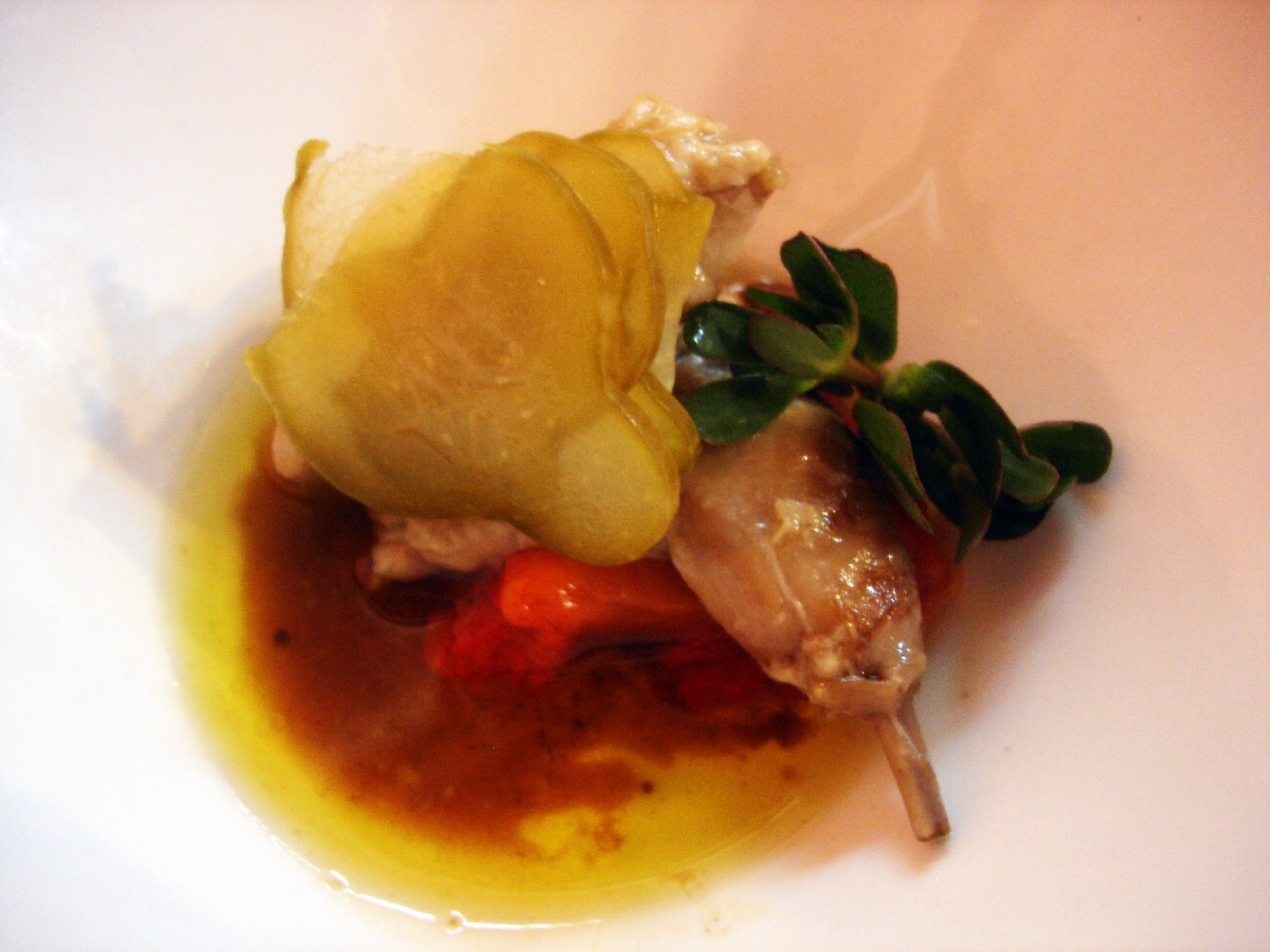 A continuación un plato tradicional de la gastronomía castellana, “muslo de codorniz en escabeche con encurtidos de la casa y verderola”.