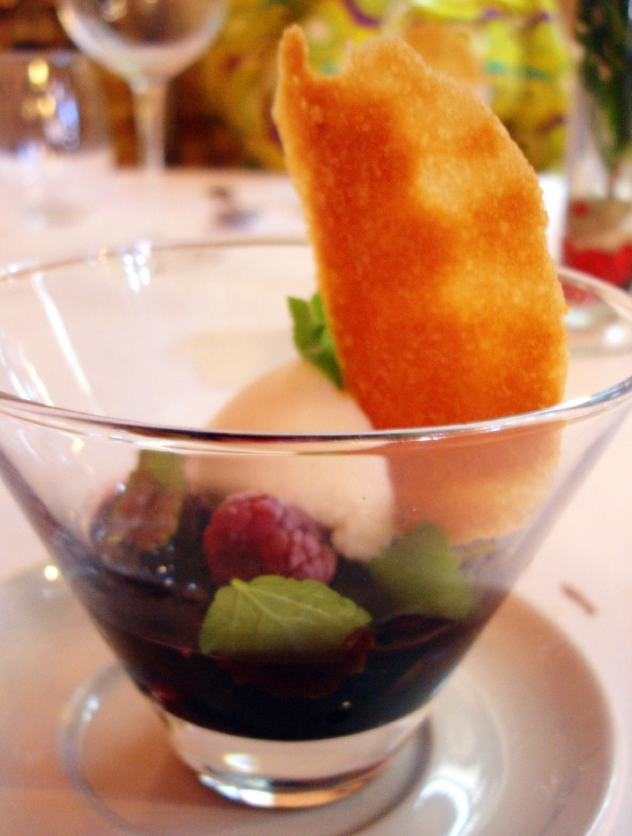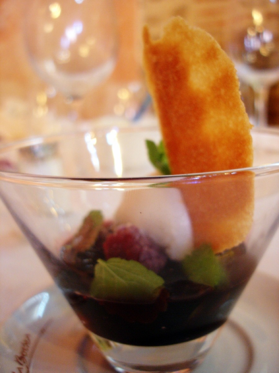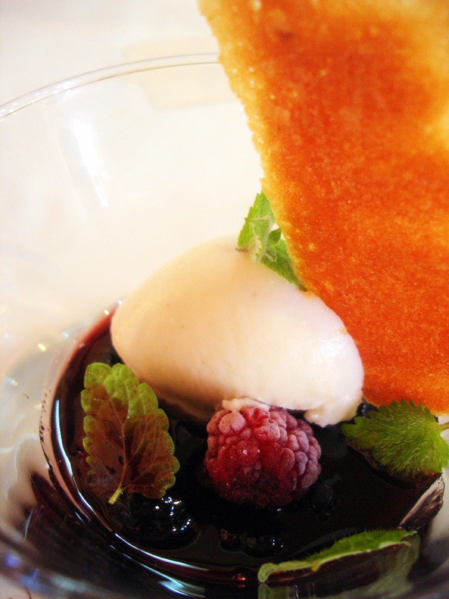 Una vez terminado los entrantes y platos principales pasamos al primero (y el mejor a mi gusto) de los postres. “Helado de pimienta verde con frutos rojos y chocolate en reducción de vino tinto”. Sorprende en boca lo bien que casa el “picantillo” del helado con los frutos rojos y el resto de ingredientes. ¡Bueno de verdad!
