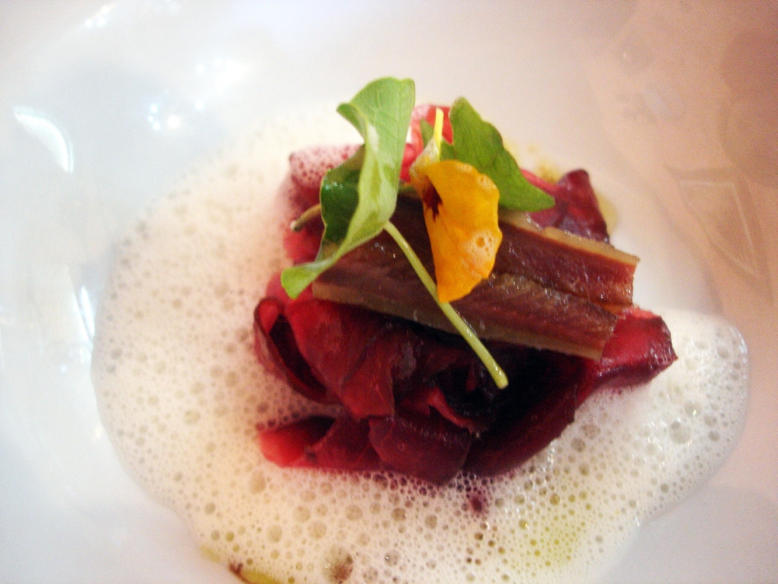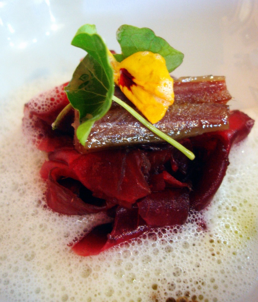 Este menú degustación (45€, IVA incluido), fue lo que pedimos ayer para comer en el restaurante La Botica. El desfile de platos comenzó con una colorida y sugerente ensalada de “remolacha roja con espuma de queso de la zona y sardina ahumada”.
