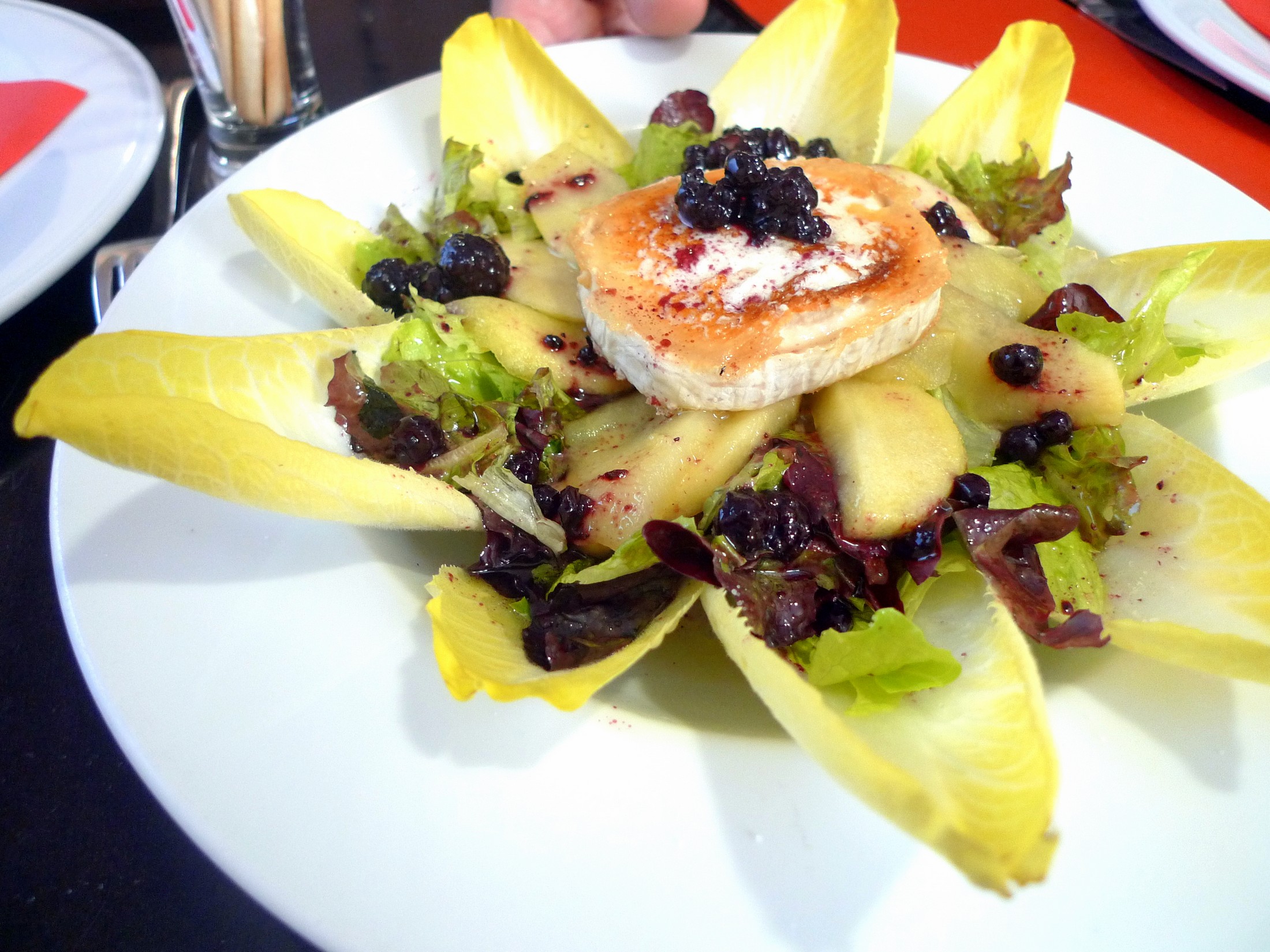Dentro de los entrantes, otra buena sugerencia “de la casa” es la ensalada de «endibias con queso de cabra, laminas de manzana y mermelada de frutas del bosque«. Una propuesta muy refrescante y de muchos contrastes.