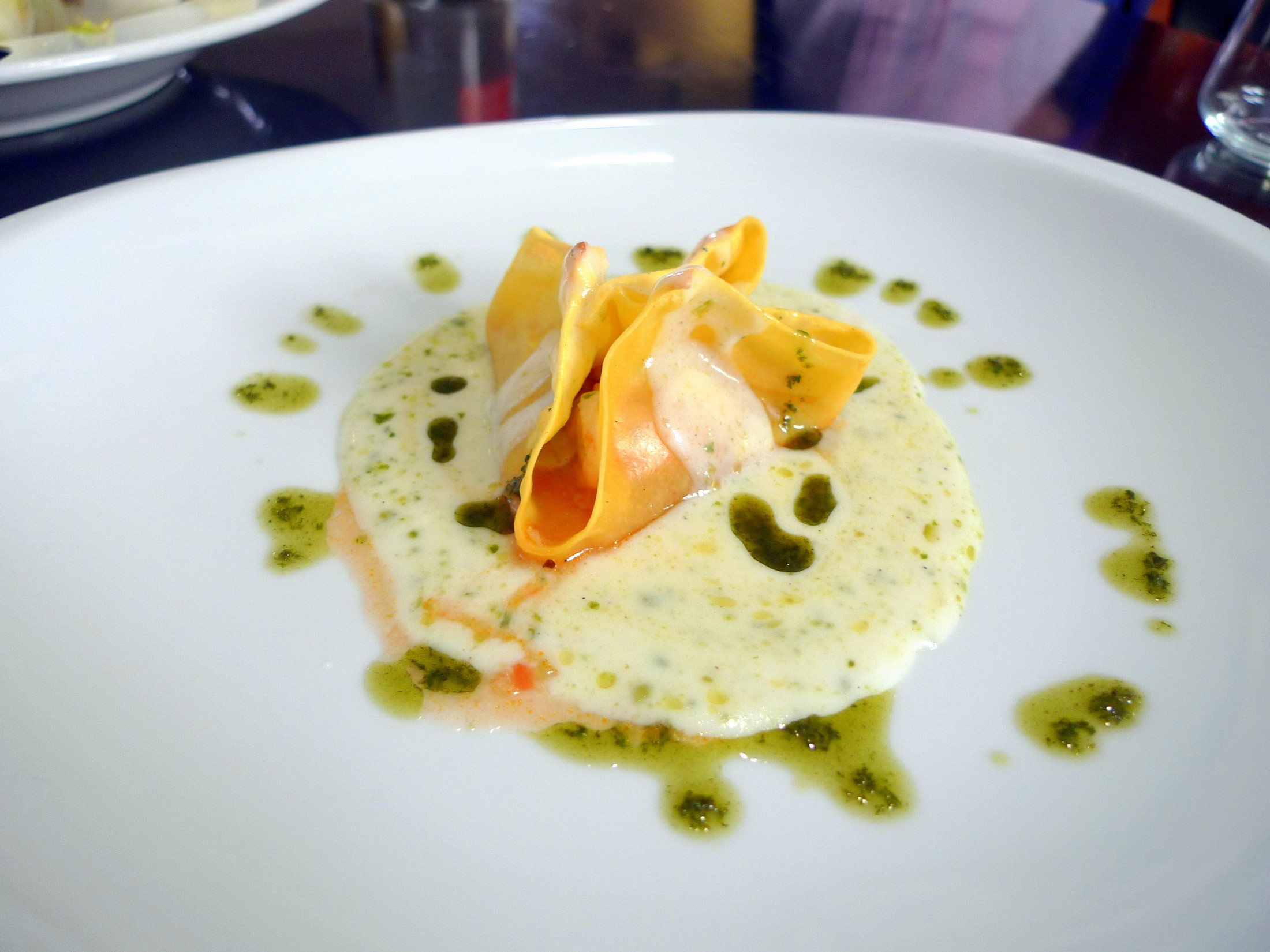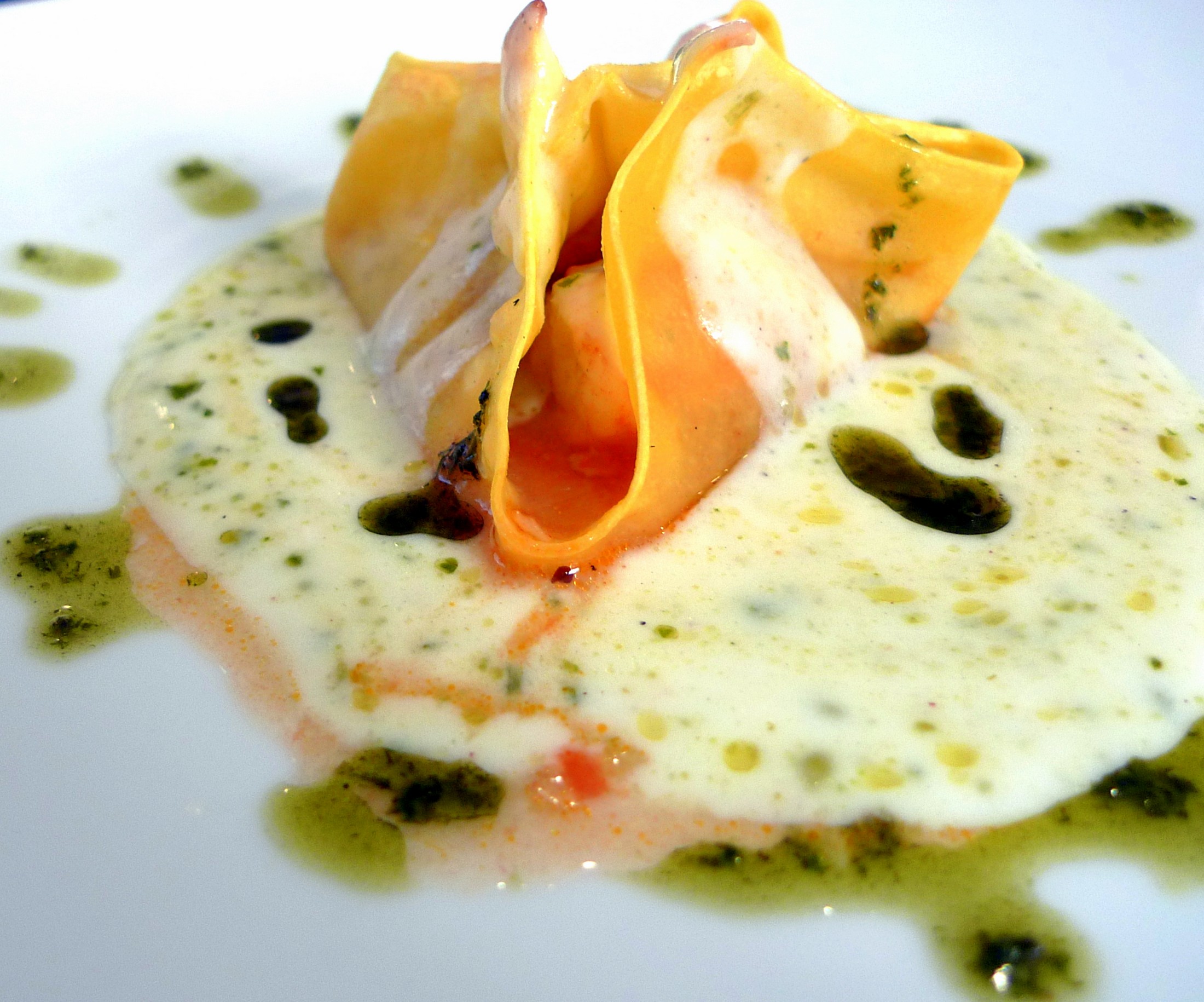 La segunda, era una lasaña de langostinos y rape con bechamel de piñones y pesto de albahaca. Una combinación fantástica que tampoco nos defraudo.