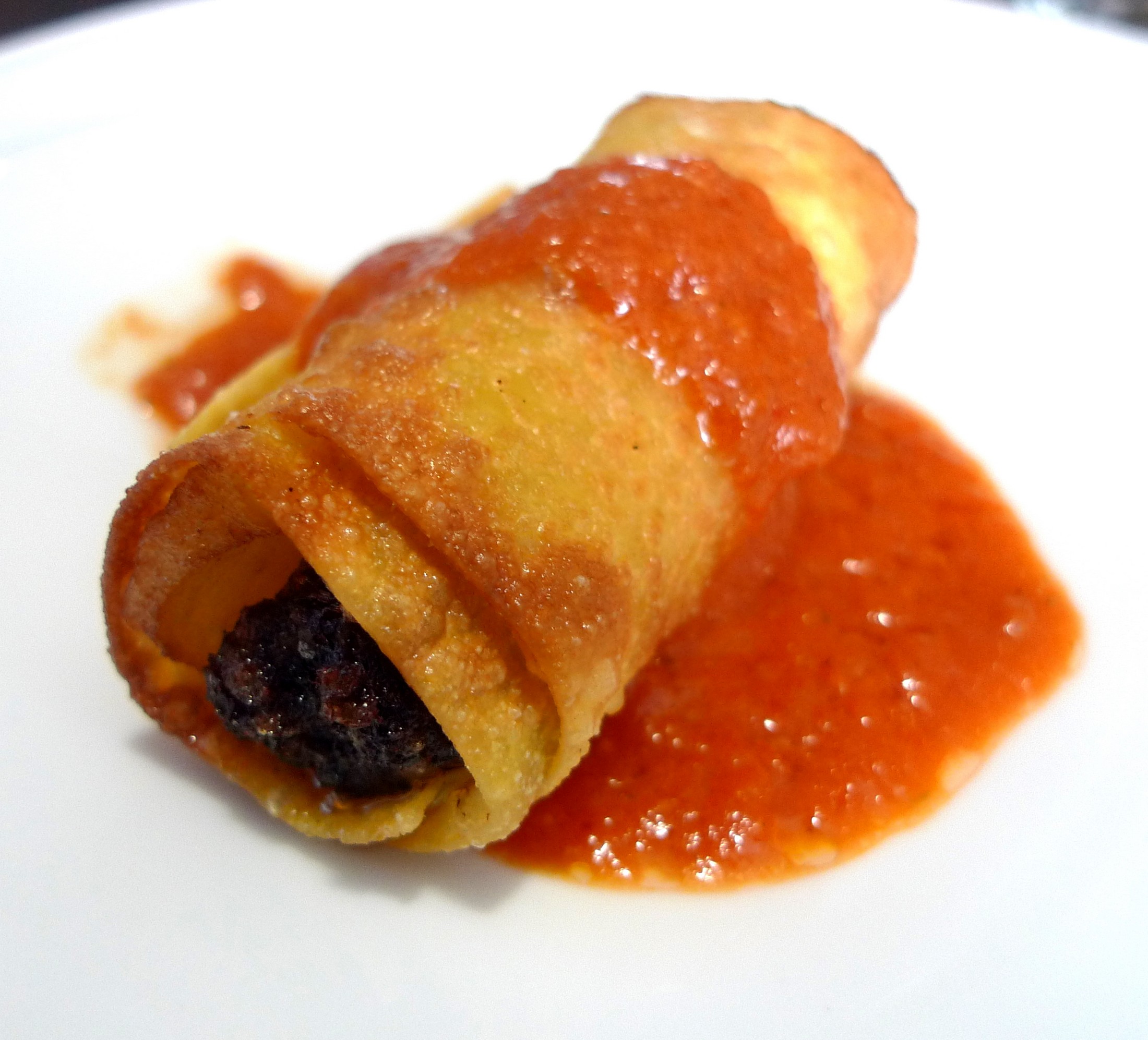 La primera estaba rellena de morcilla, con manzana caramelizada y salsa de tomate, realmente deliciosa y muy vistosa ya que su presentación se aleja de la manera habitual para este tipo de preparación.