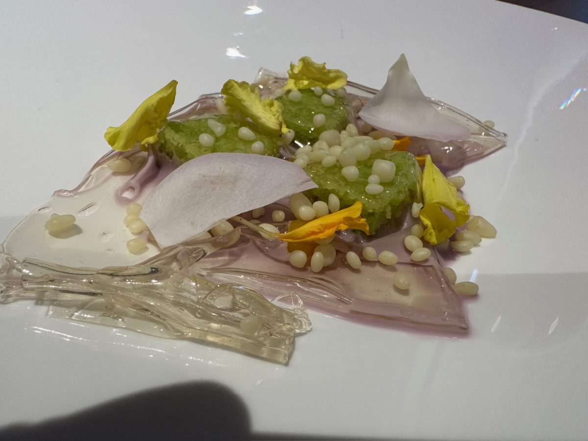 - Mosaico de la tierra: merengue de ajo morado de las Pedroñeras, Wonton con crema de duelos y quebrantos y zumo de Gordal encurtida
