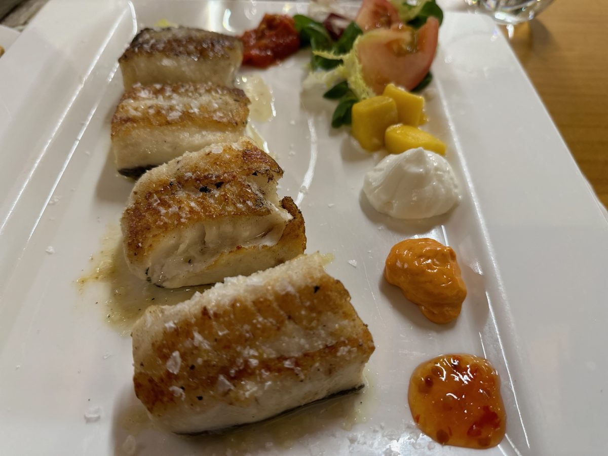 - Bacalaó tiznaó a baja temperatura acompañado de salsa de papas con choco, con alioli de azafrán de la Mancha y espagueti de perejil y torreznitos de la piel del bacalao.