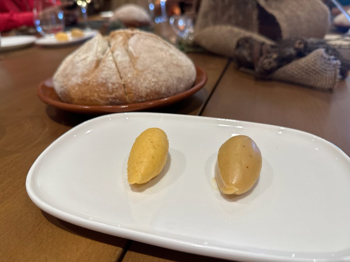 - Pan de masa madre de cebada, mantequilla de leche de vaca ahumada con praliné de almendras y mantequilla de leche de vaca encurtida con corazones de berenjenas de Almagro.