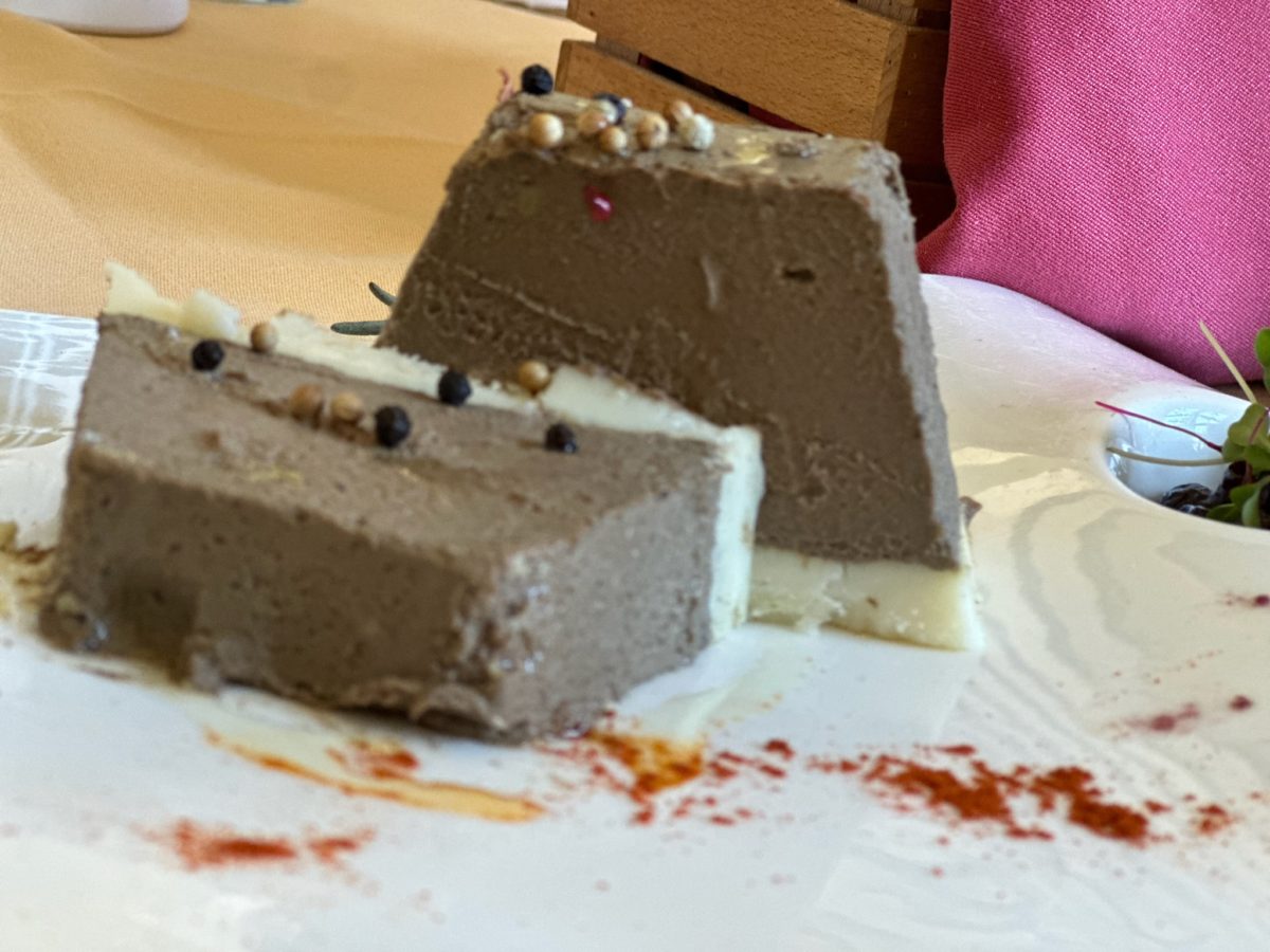 - Paté de pato entre dos tejas de almendra y harina de almorta, acompañado de gel de mostillo