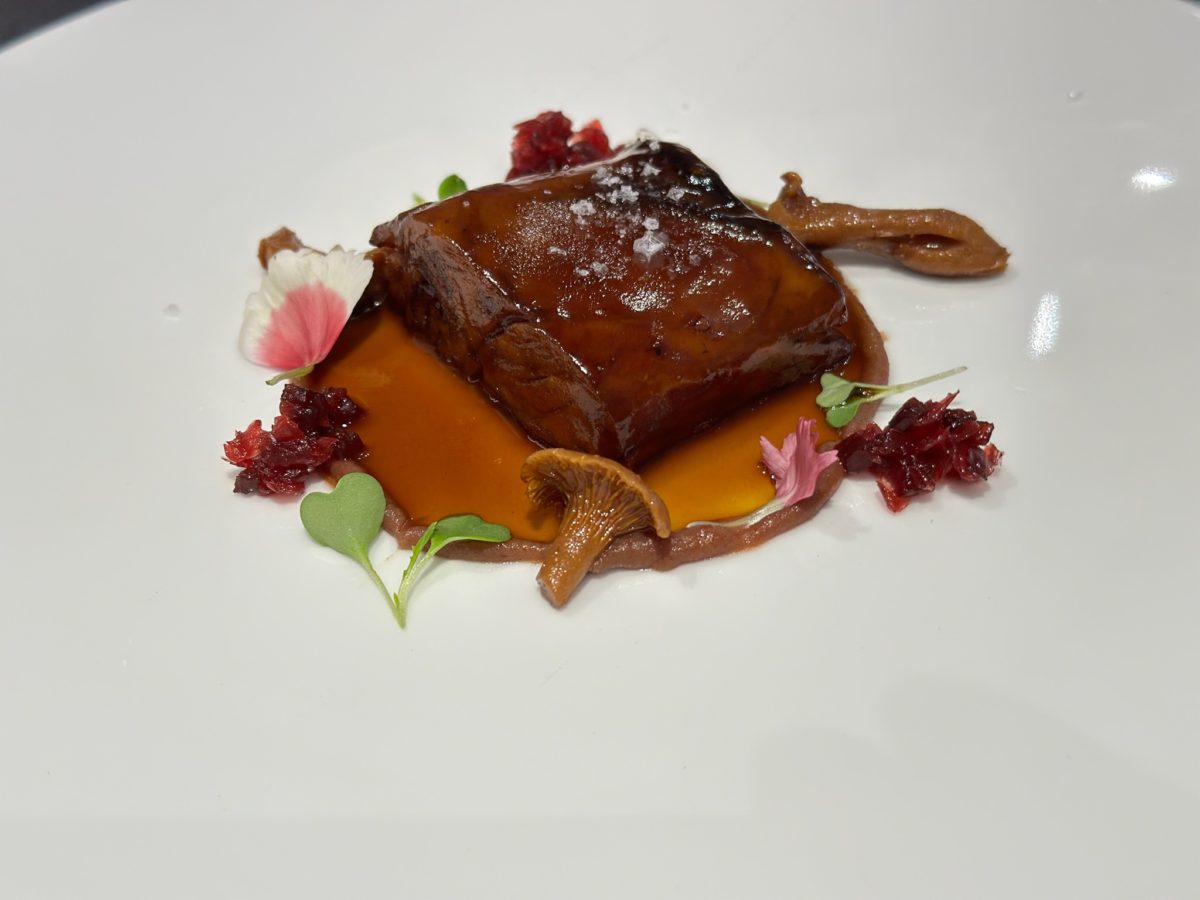- Paletilla de cordero lechal manchego deshuesada y asada a baja temperatura con fondo de crema de dátil, salsa de jugo de cordero y ostras y guarnición: cebolla morada, y remolacha, rebozuelos confitados y decorado con clavel y mizuma.