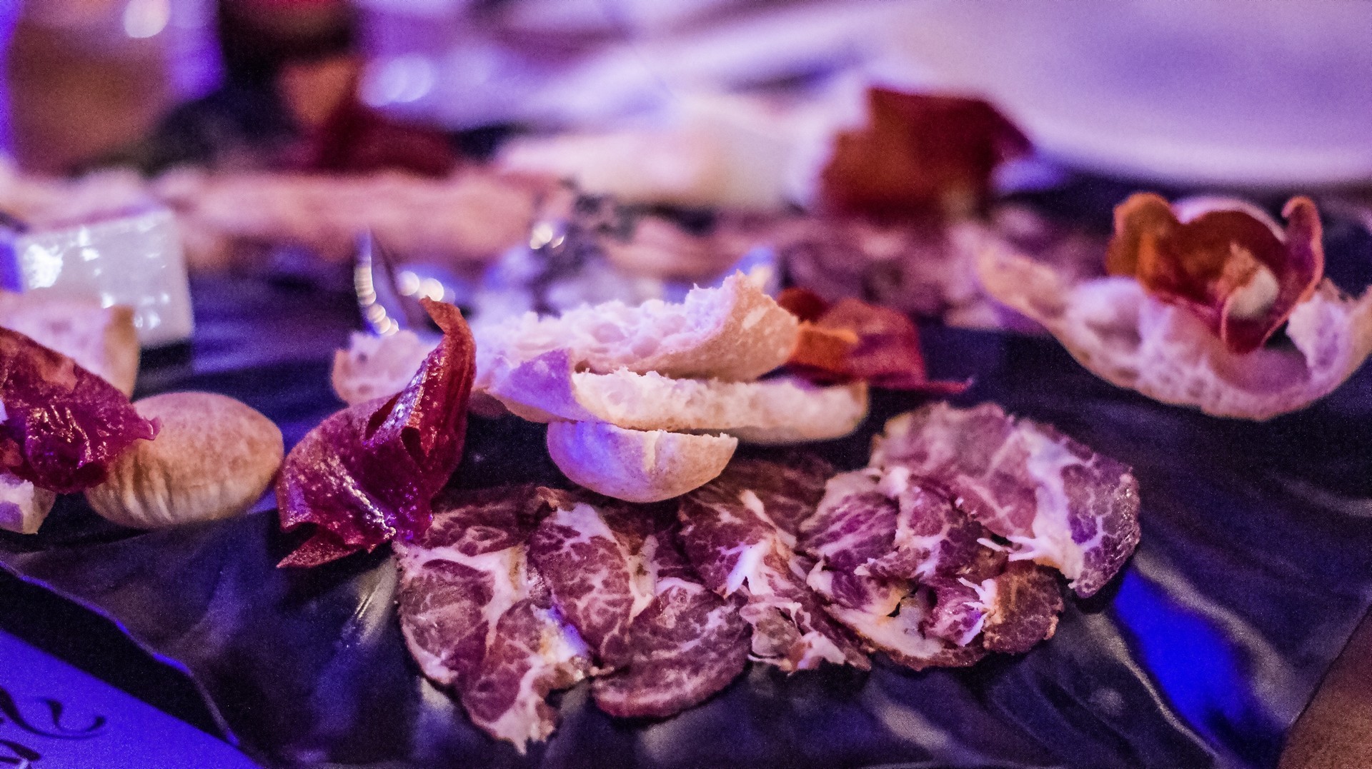 Una elaboración de embutido casero de Porc negre (cerdo de raza autóctona) curado en Sa Brisa. Acompañado con manteca de cerdo casera al aroma de hierbas silvestres Ibicencas, pan de cristal, airbags y air-baguettes de pan, tomate rayado ibicenco y cristales de tomate crujiente.