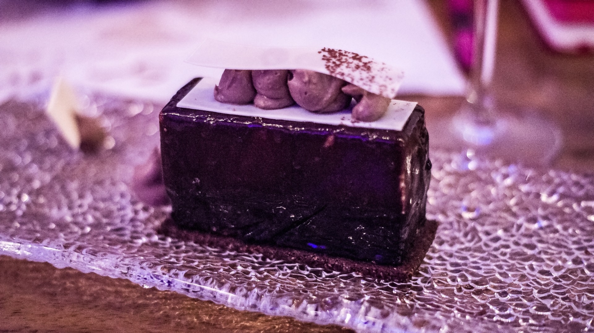 Y una Gacholada con cremoso tanariva, sablé de cacao y espuma de plátano con lima.