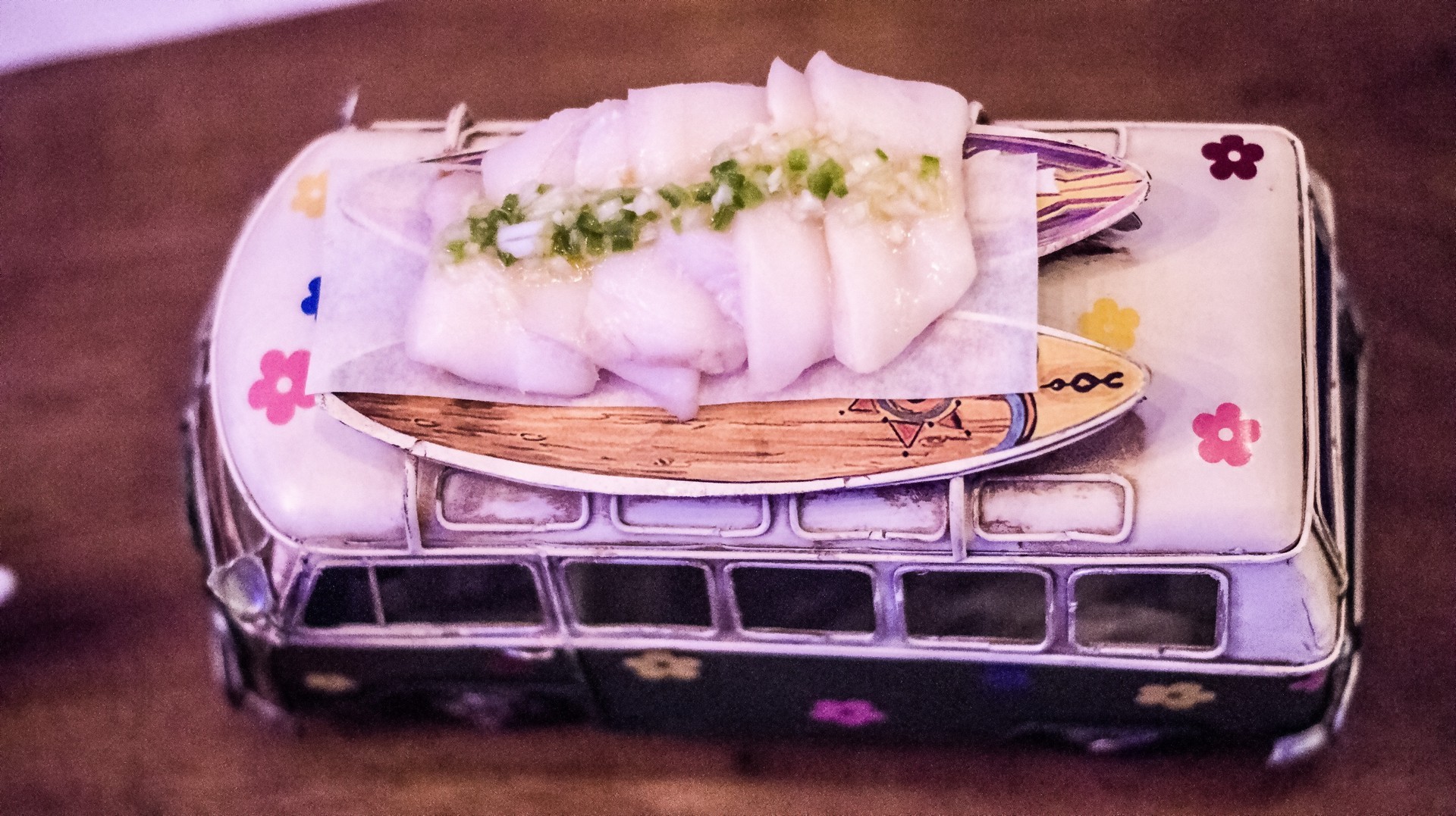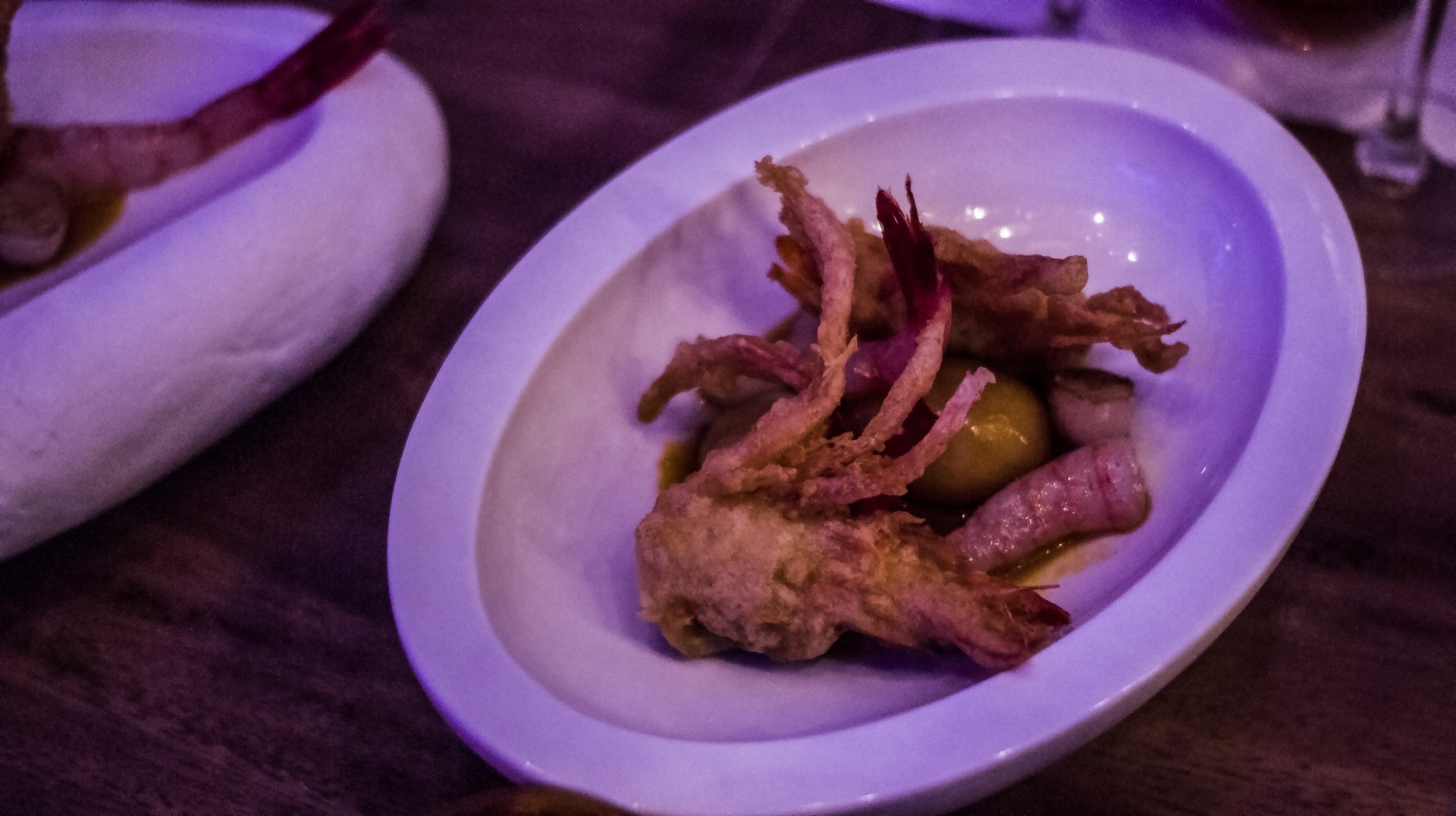 Siguiendo con las presentaciones originales, continuamos con unos donuts crujientes a base de patata ibicenca soufflé con tres salsas: mayonesa de trufa, anticucho y chili sauce. Nada que destacar aquí.