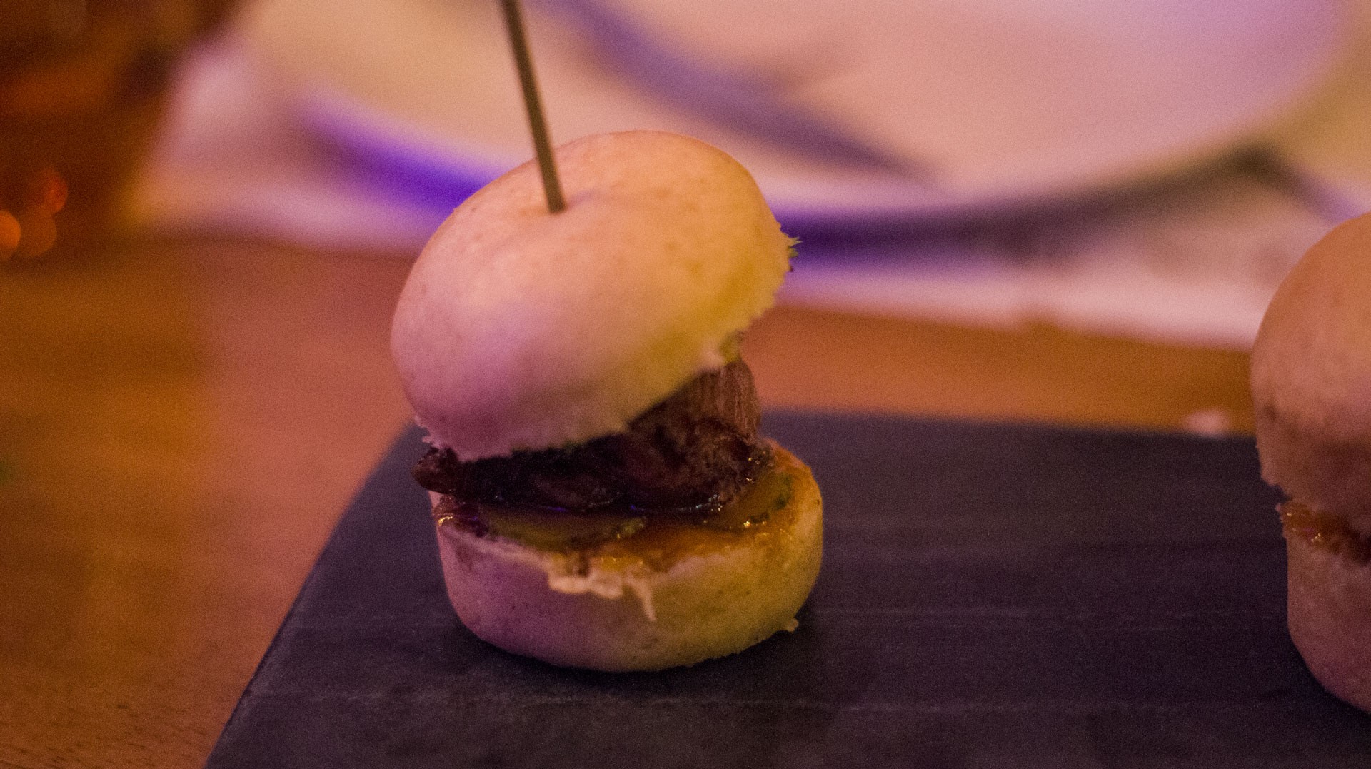 Una mini hamburguesa elaborada con papada de porc negre ibicenco sobre pan chino casero al vapor, pepinillo, mostaza pommery y chutney de mango fue el siguiente plato. Un bocado apetecible.
