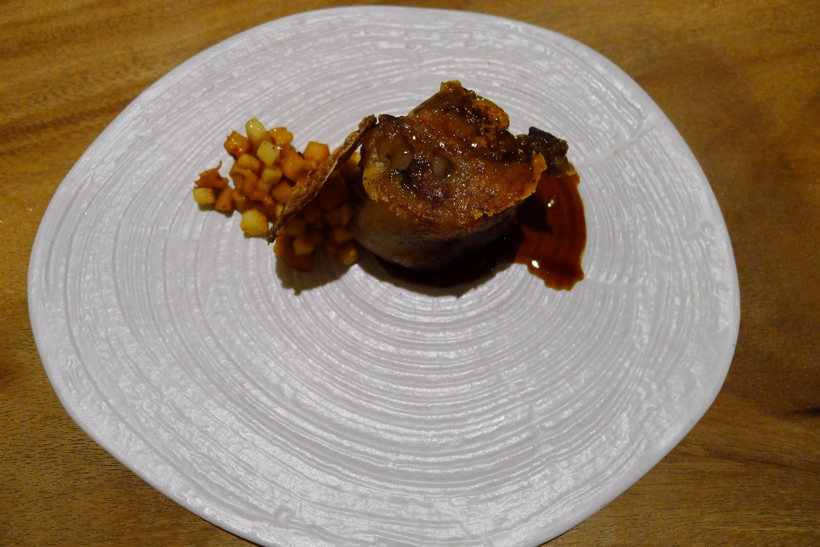 Pasamos después a una tarrina de manitas de porc negre ibicenco con manzana verde en dos texturas y salsa coreana gouchan casera. Una deliciosa mezcla de sabores.