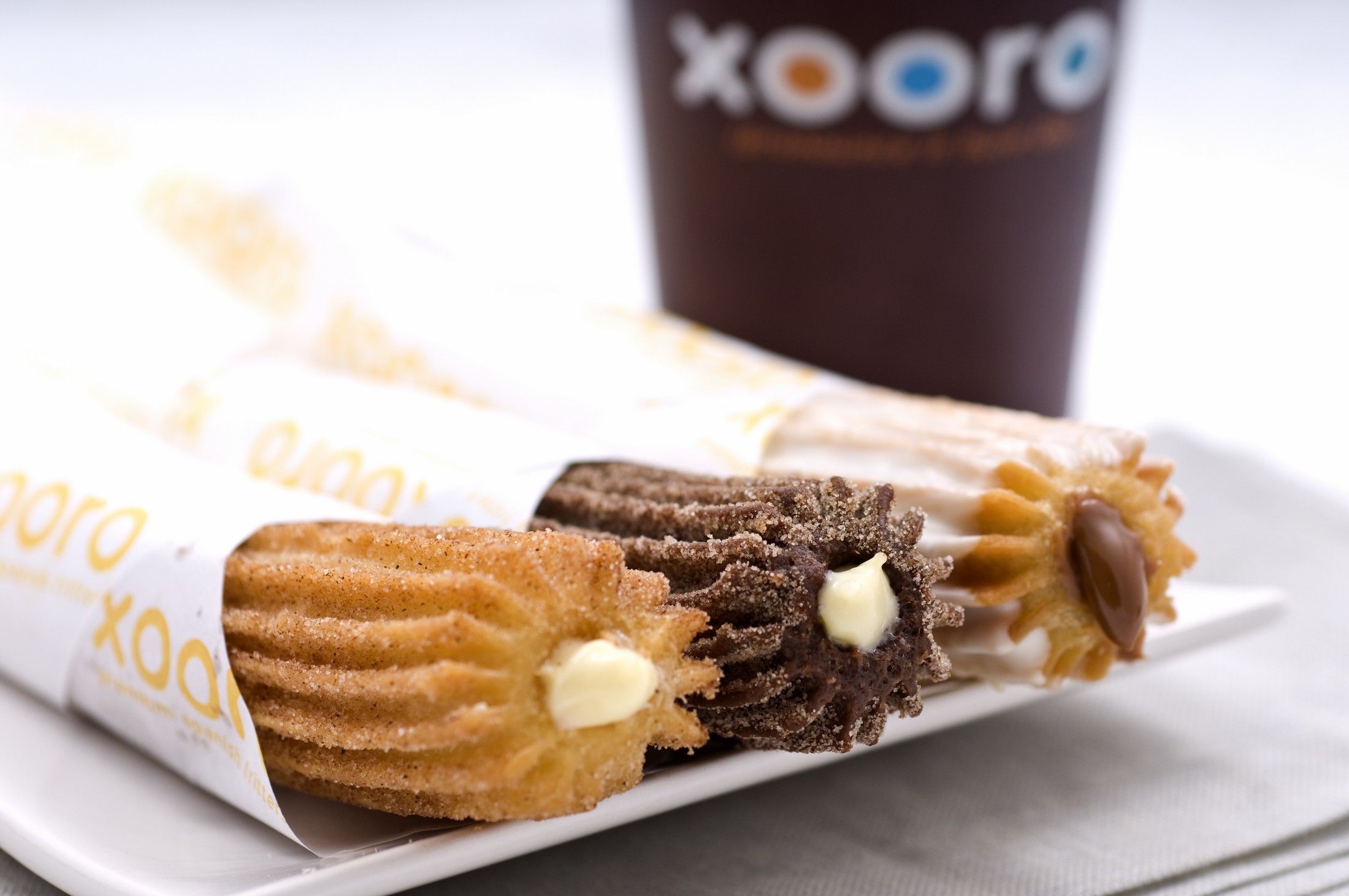 Hay muchas variedades, churro relleno con crema de vainilla y cubierto de azúcar y canela, rellenos con crema de mango y pistachos cubiertos por coco y chocolate blanco, o podemos elegir uno cubierto con avellana turca relleno con dulce de leche, o que te parece tomar un churro de leche de cabra recubierto con un dulce caramelo, etc., cada dos semanas introducen alguna variedad nueva en la carta. En Xooro también encontramos churros bajo en carbohidratos y aptos para celíacos sin gluten.