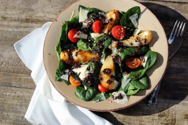 Ensalada de espinacas con pera caramelizada y vinagreta de tapenade de aceitunas negras, una receta facilona para disfrutar sólo o...