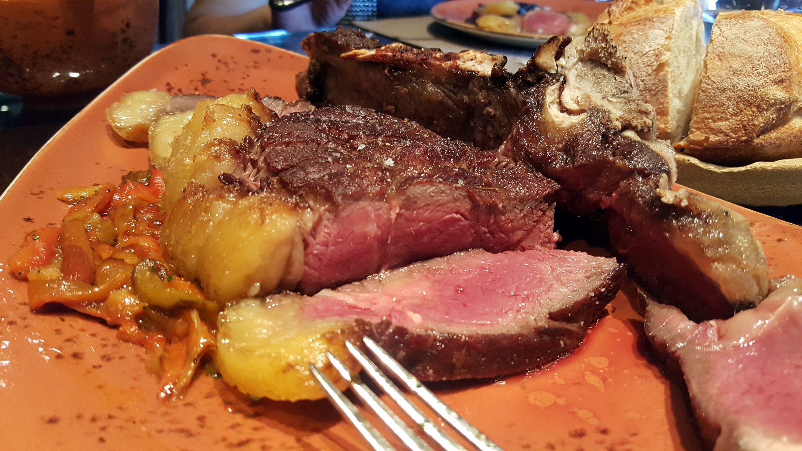 Como plato principal, y previo consenso por todas las partes, nos decantamos por una «Chuleta de vaca curada 40 días, acompañada con pimientos asados y bol de patatas».