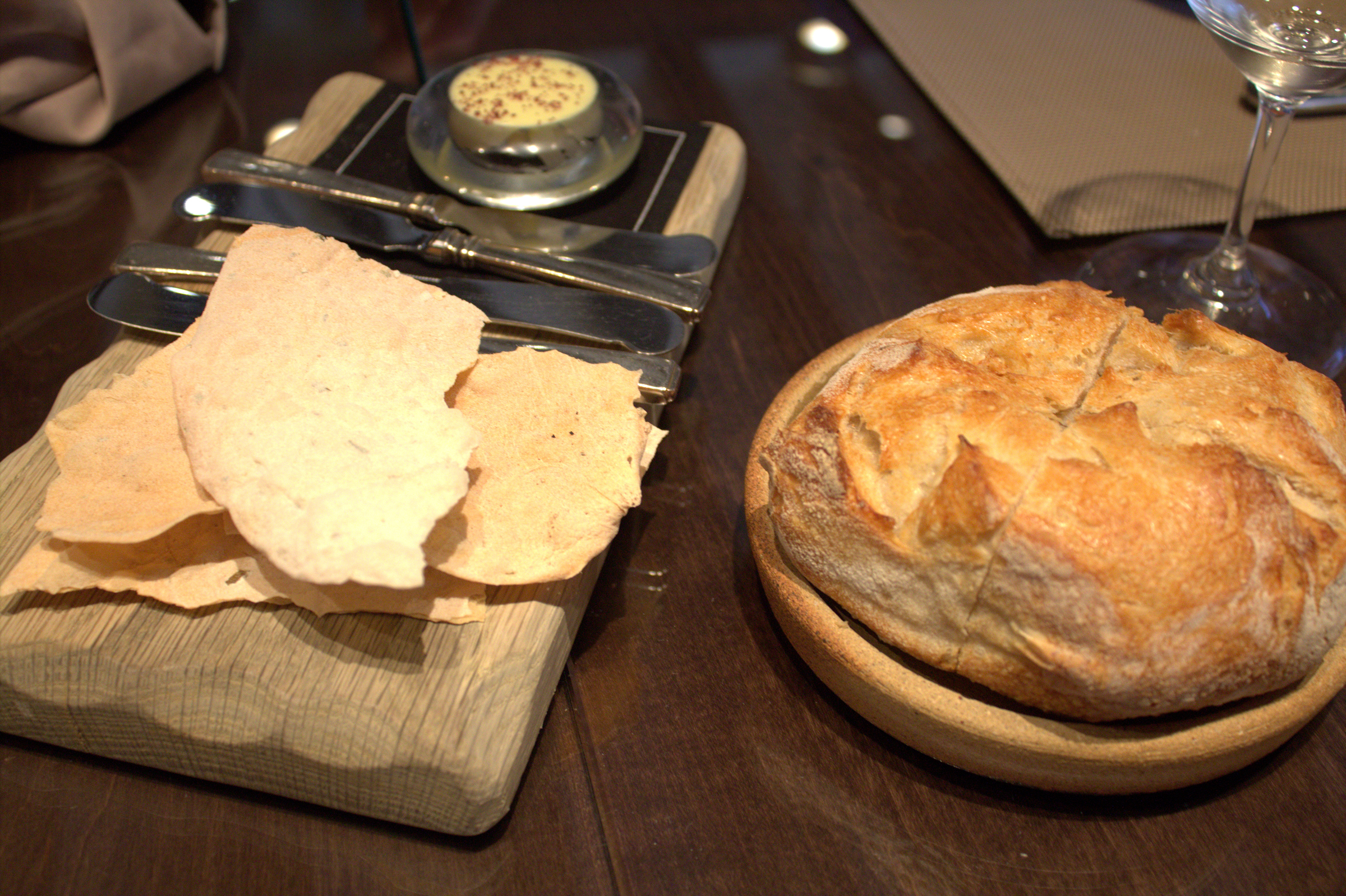 Elegidos los platos, servida la bebida y para hacer más amena la espera, nos pusieron sobre la mesa una crema de aceite de oliva virgen extra con sal de vino de elaboración propia, acompañada de unas láminas de pan crujiente de romero. Volaron.