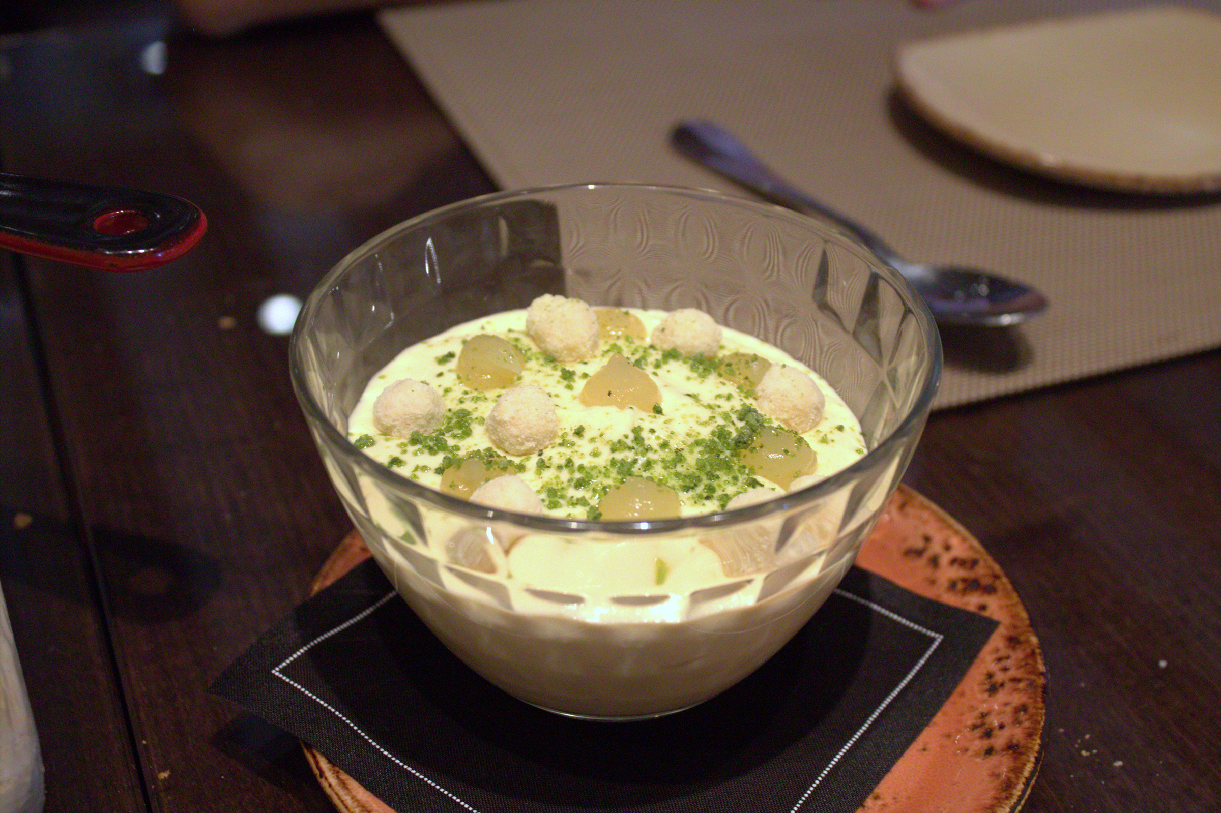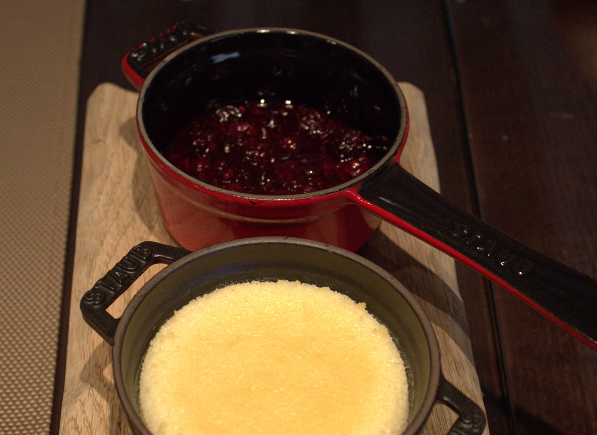Para terminar nos dejamos aconsejar de nuevo y como postre pedimos, también para compartir, unas sorprendentes «Natillas de albahaca, manzana y galleta rota» y «Tarta caliente de queso –curado- con frutos rojos».