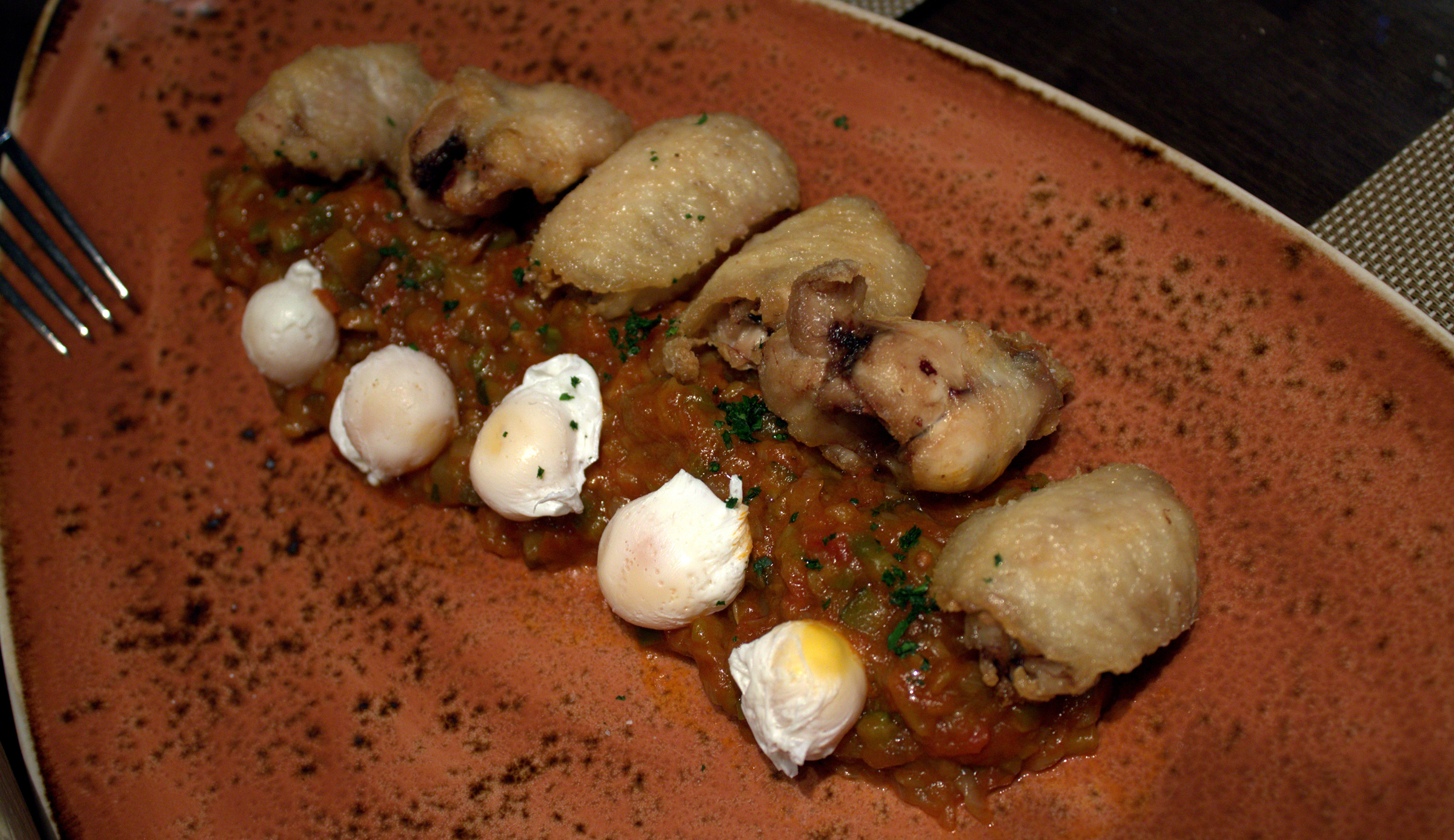 Para dar gusto a los más pequeños el segundo consistió en un «Pisto agridulce con Alitas de pollo deshuesadas confitadas y huevos de codorniz poché».  Un plato divertido que hizo desaparecer el pan de la mesa.