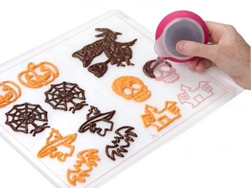 Para todas aquellas personas que les gusta esta fiesta y elaborar dulces «terroríficos», Lékué ha creado una plantilla de temática de Halloween, gratuita, para usar junto con el nuevo Kit Decomat. Una idea que encantará a todos y en especial a los pequeños de la casa, ya que podrán personalizar sus postres favoritos dibujando pequeñas figuras de chocolate de Halloween.